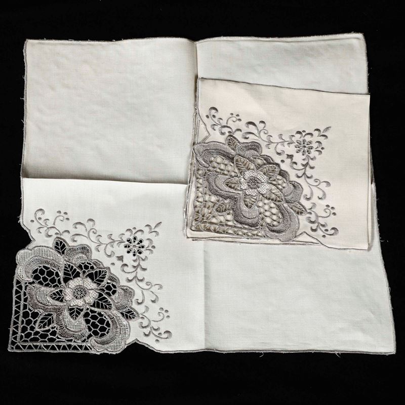 Dimensioni: tovaglia cm 245x170; tovaglioli cm 42x42. Conservazione: importanti usure e qualche rottura