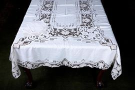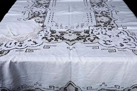 Lino con ampi inserti e bordo eseguiti al tombolo, inoltre ricami e intagli