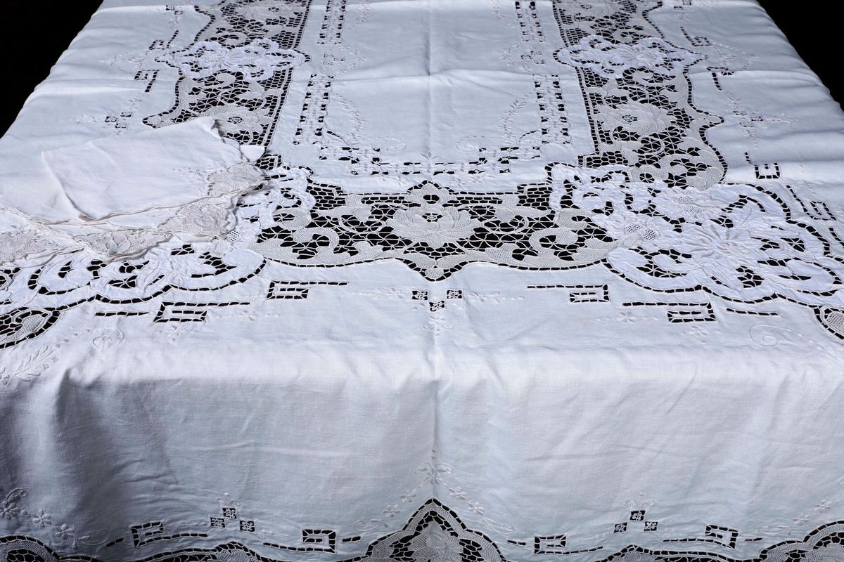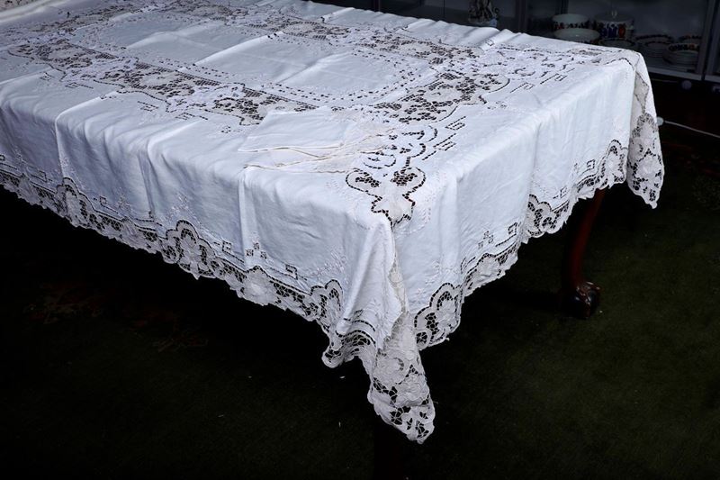 Dimensioni: tovaglia cm 237x160, 12 tovaglioli cm 40x40. Conservazione: ottima