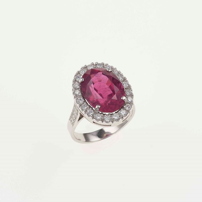 Anello con rubellite di ct 9.32 e diamanti a contorno
