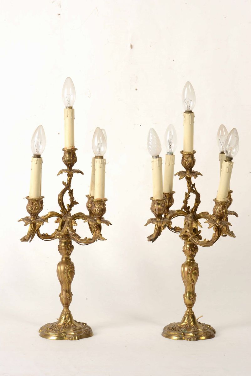Coppia di candelabri in bronzo dorato a sei fiamme. XX secolo
