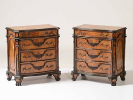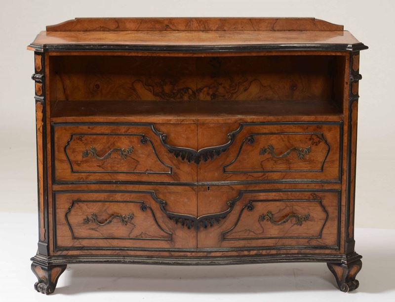 Coppia di comodini e cassettone in stile lombardo in legno lastronato con cornicette ebanizzate