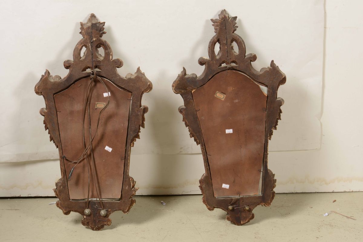 Coppia di ventoline in legno dorato e intagliato. XX secolo