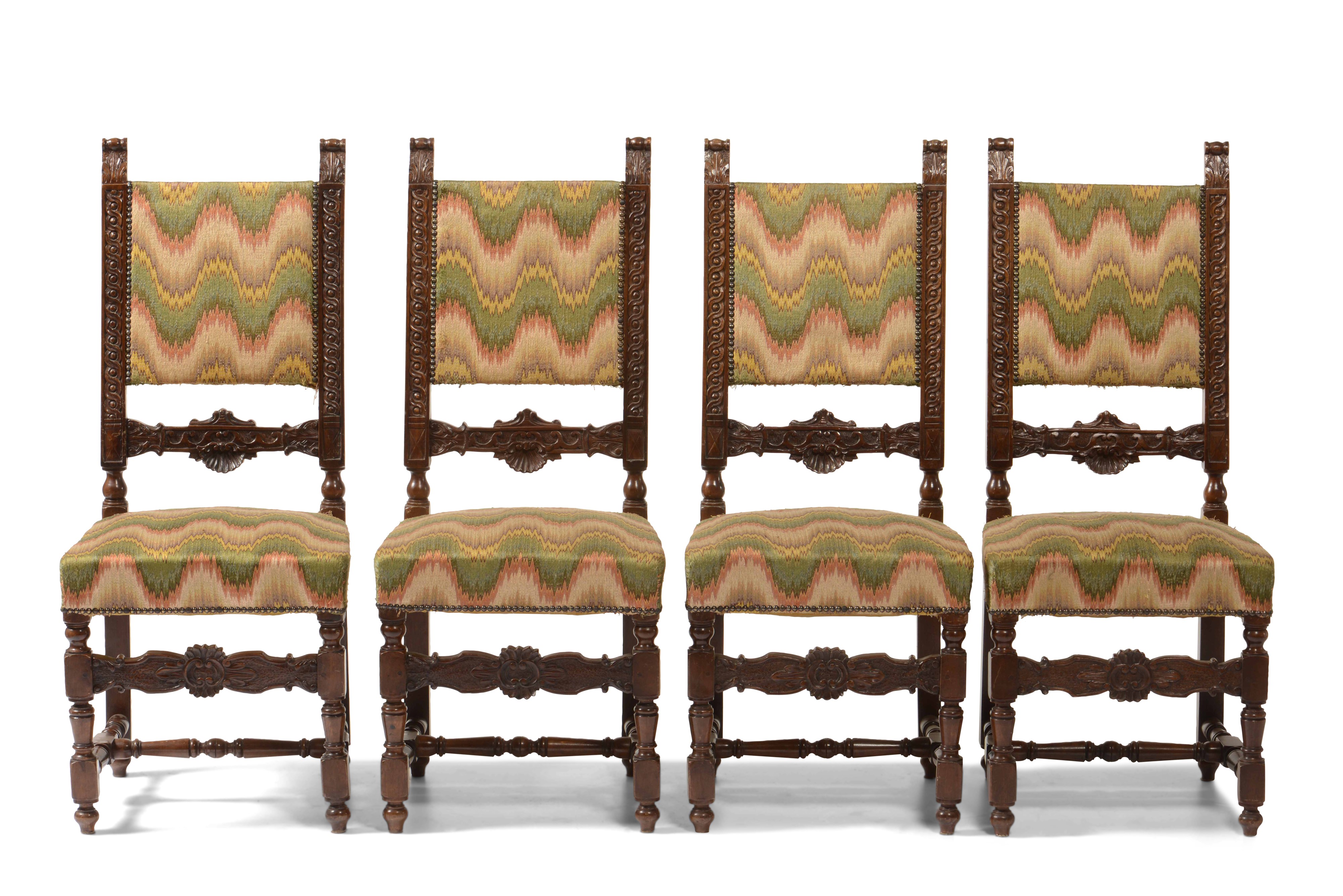 legno intagliato, sedute e schienali rivestiti con tessuto policromo fiammato