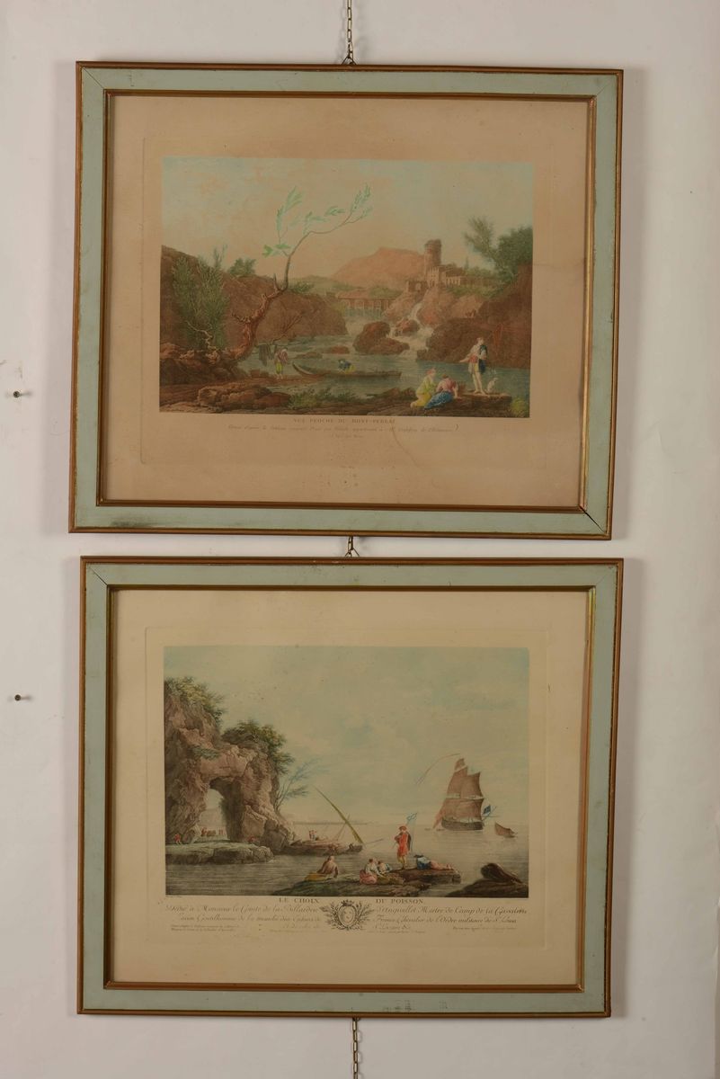 Gruppo di sei incisioni acquerellate raffiguranti scene di pesca. XIX secolo