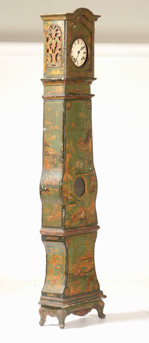 Orologio a torre con cassa in legno laccato a chinoiserie