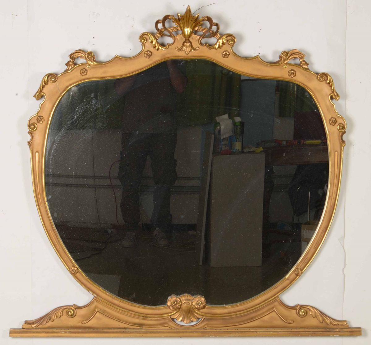 Specchiera in legno intagliato e dorato di forma sagomata con riccioli