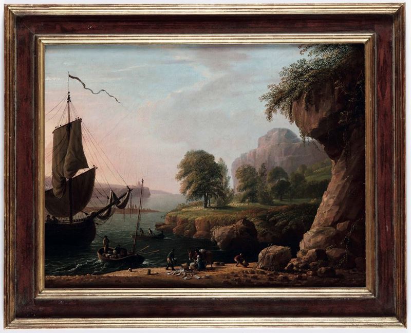Scuola fiamminga XVIII secolo Paesaggio con pescatori
