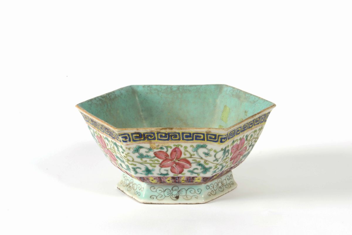 Alzata in porcellana a smalti policromi con decori floreali, Cina, Dinastia qing, XIX secolo