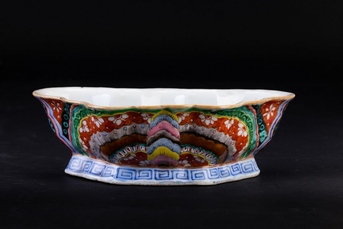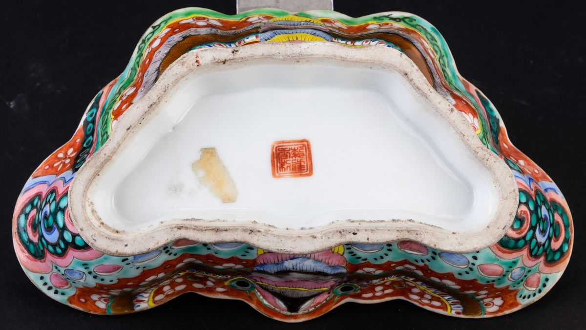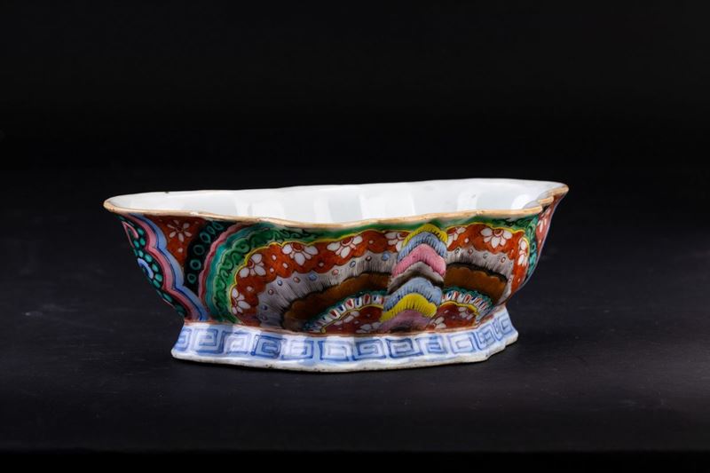 Alzata in porcellana a smalti policromi con figura di fenice, Cina, Dinastia Qing, XIX secolo
