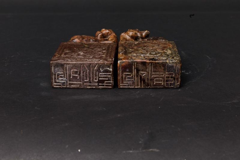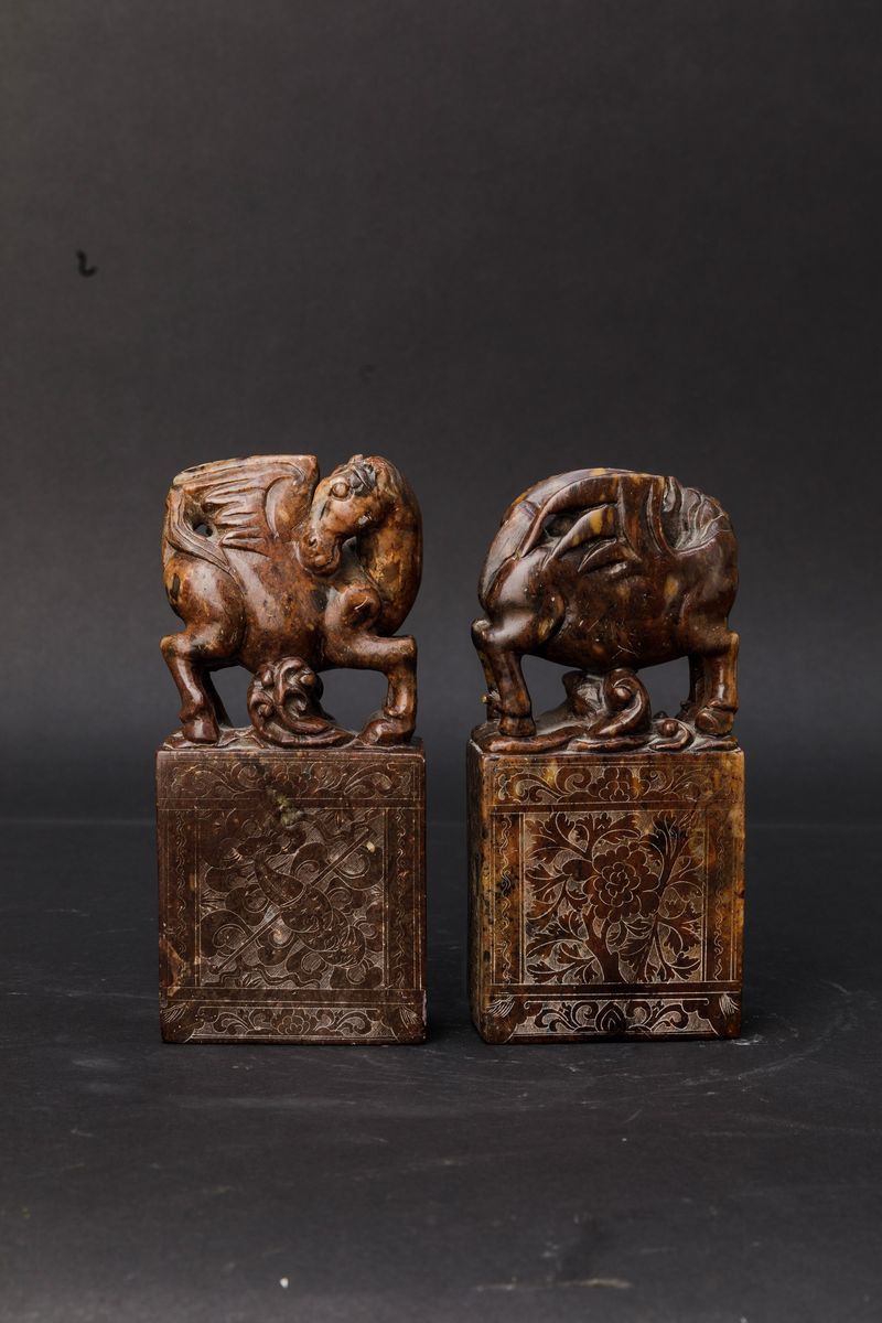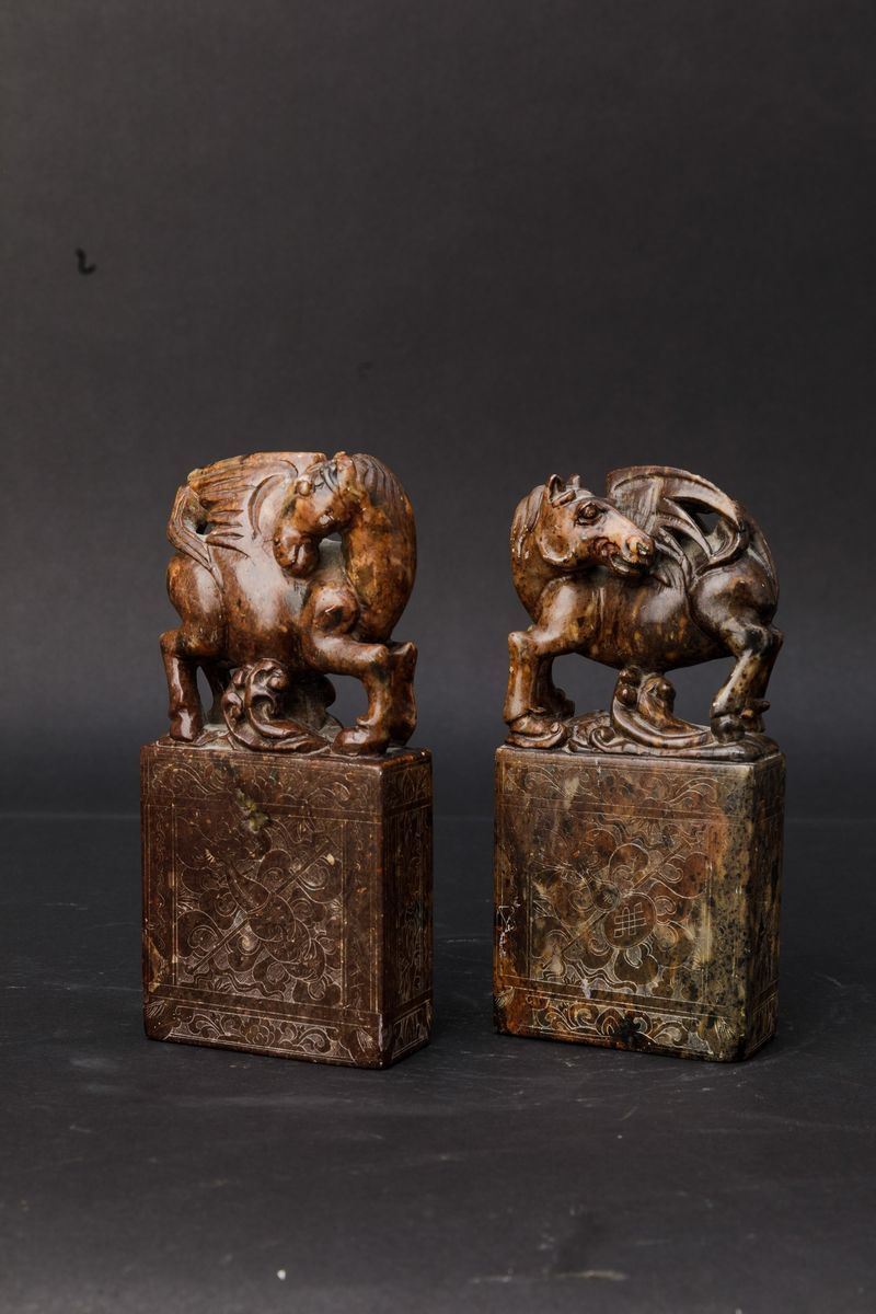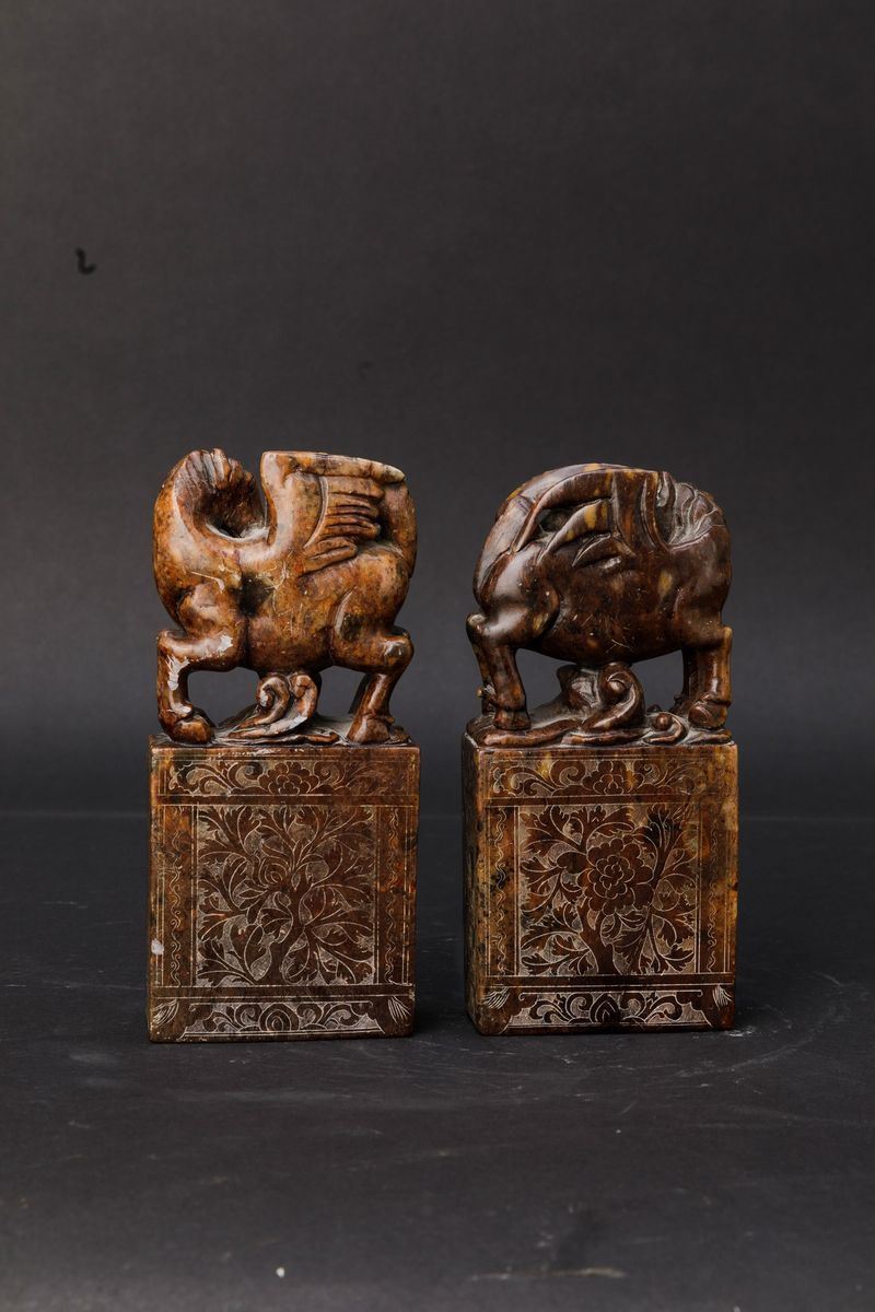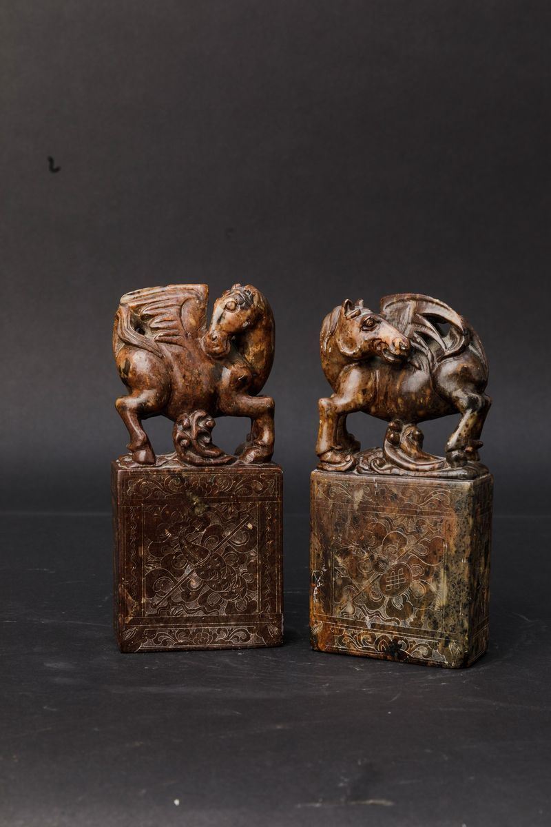 Coppia di gruppi in saponaria con figure di cavalli alati e decori naturalistici incisi, Cina, XX secolo