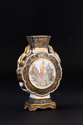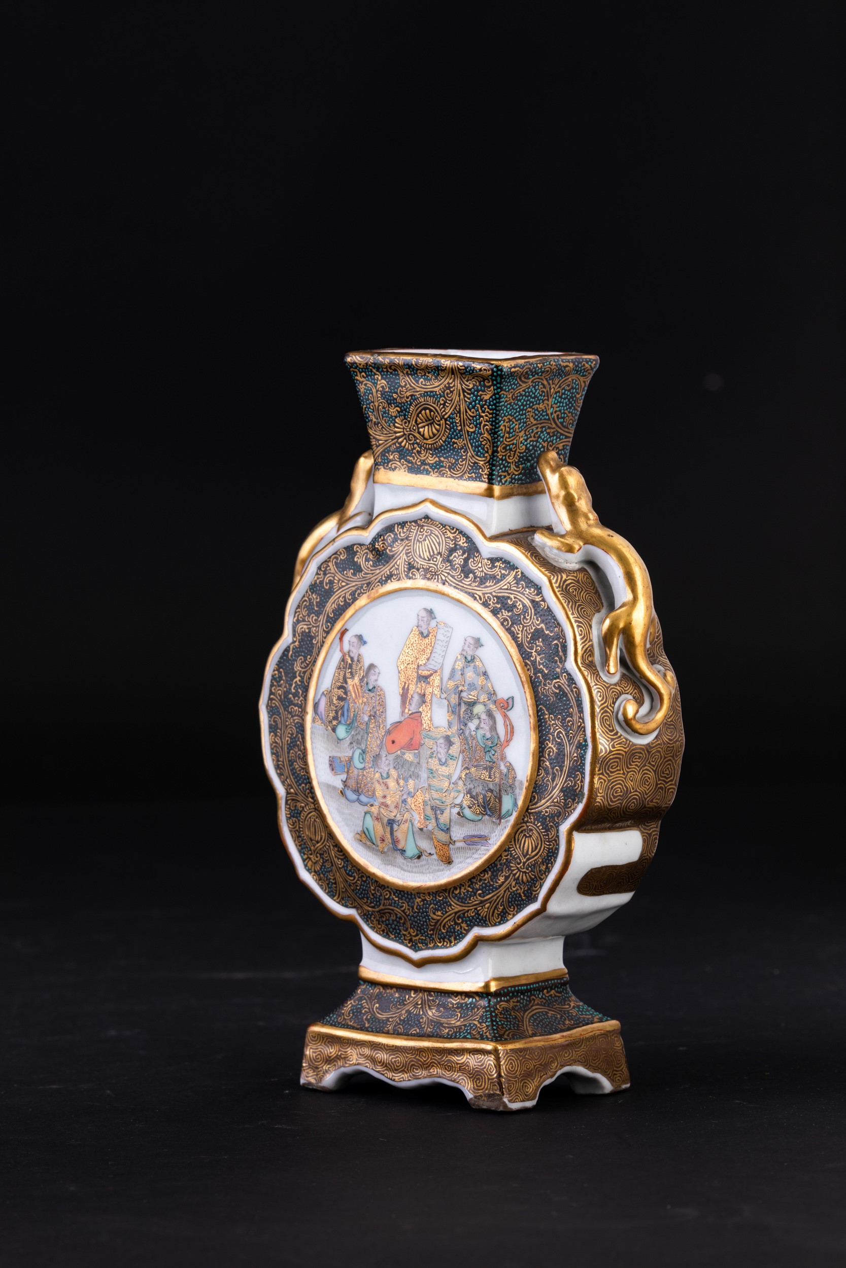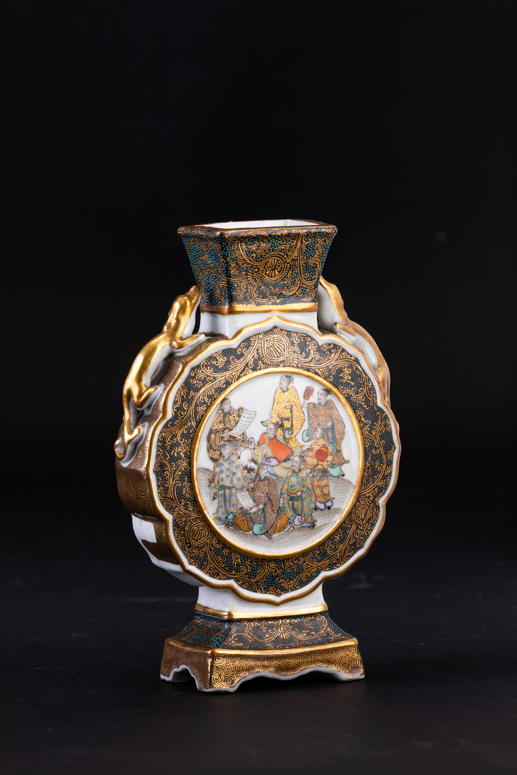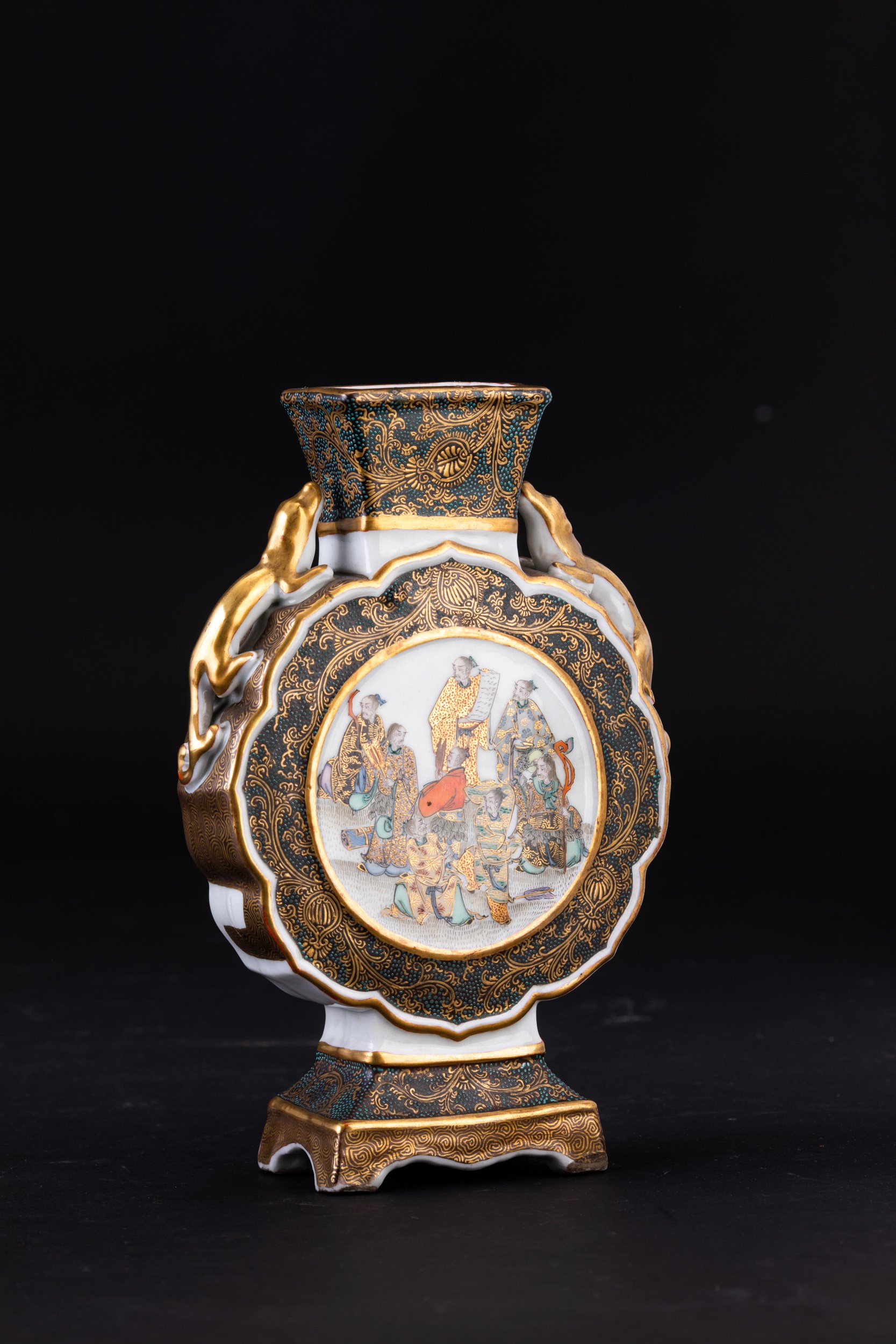 Fiasca in porcellana con figure di draghetti a rilievo e raffigurazione di saggi, Giappne, periodo Meiji (1868-1912)