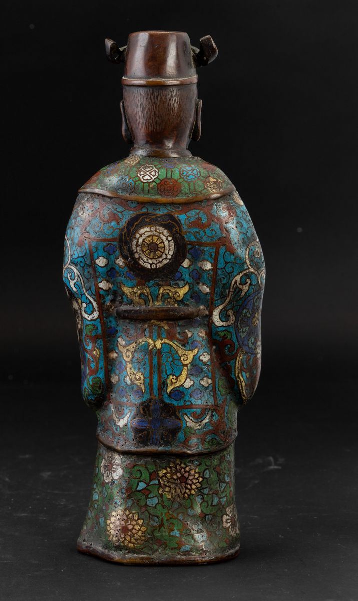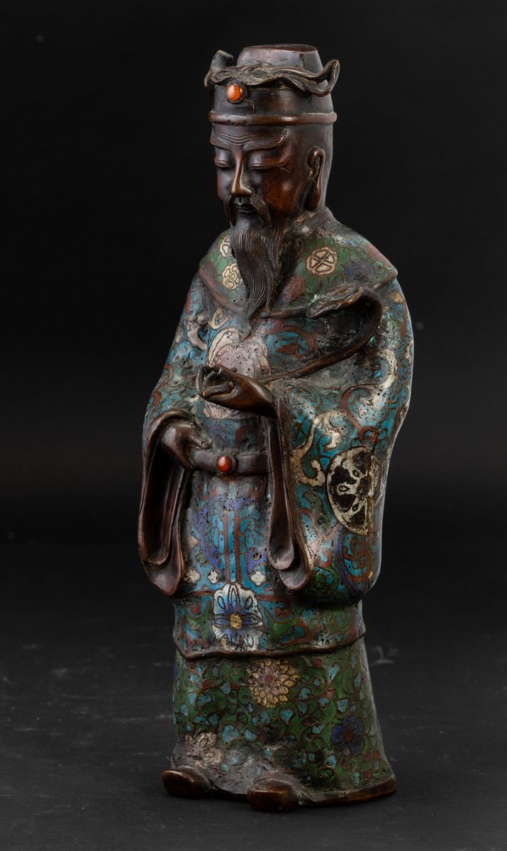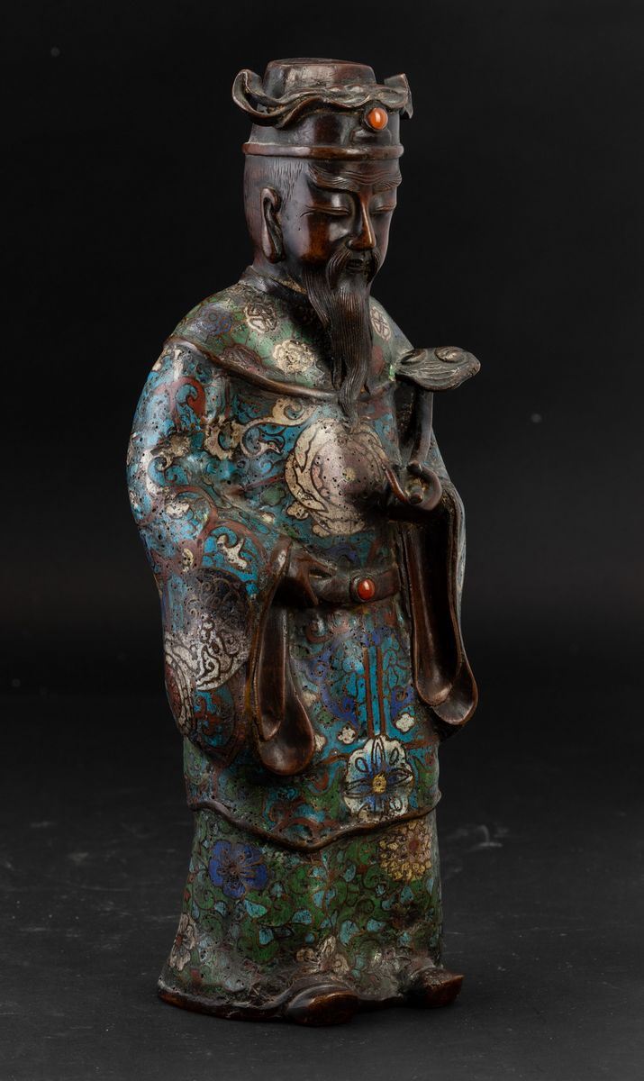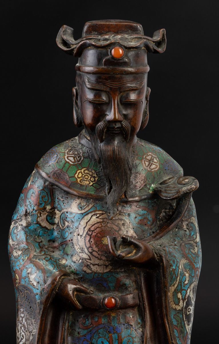 Figura di saggio con Ruyi a smalti cloisonnè e innesti in pietre dure, Giappone, periodo Meiji (1868-1912)