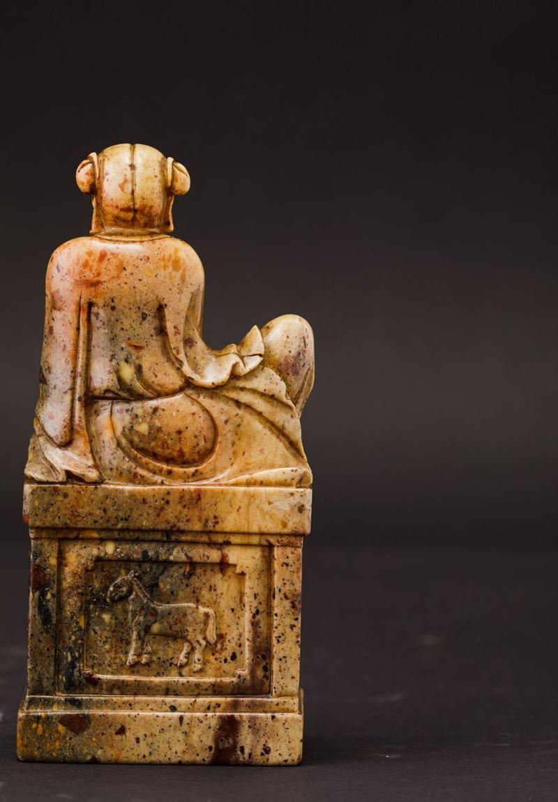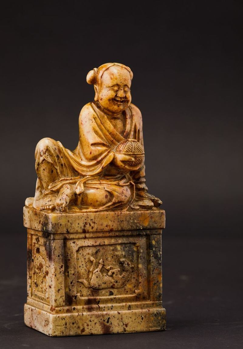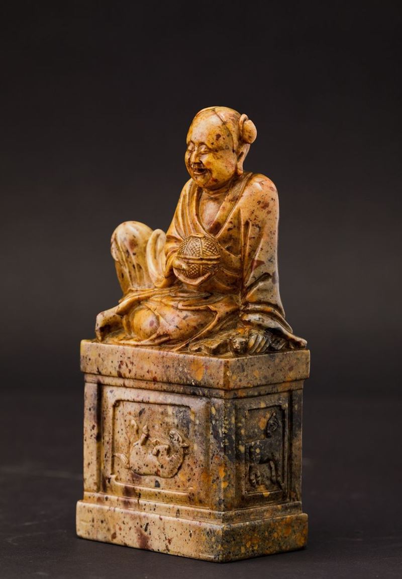 Gruppo scolpito in saponaria con personaggio che regge una sfera, Cina, XX secolo