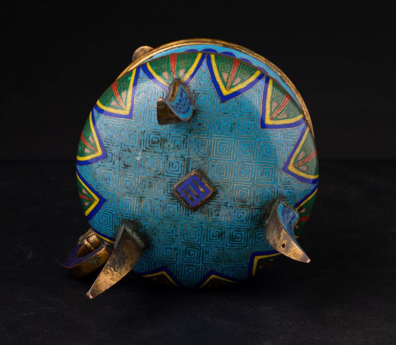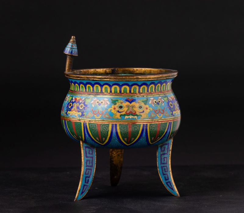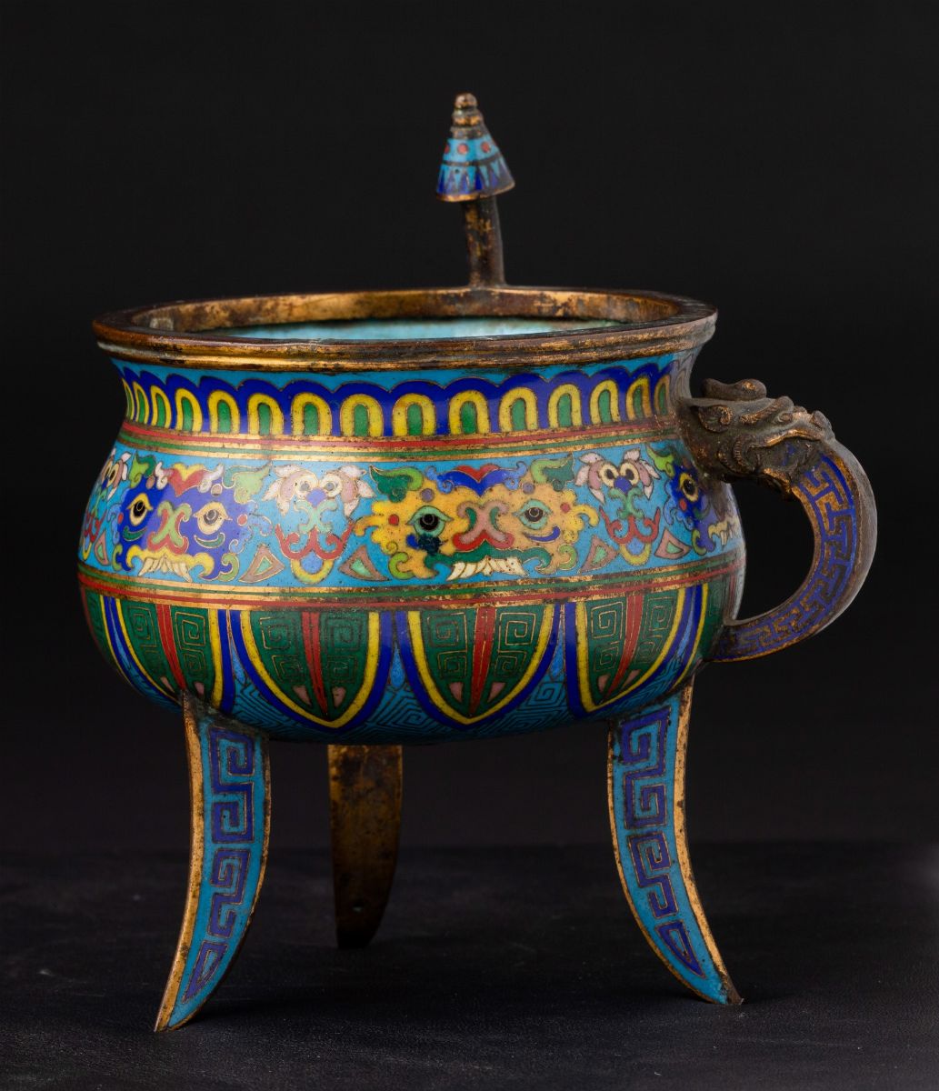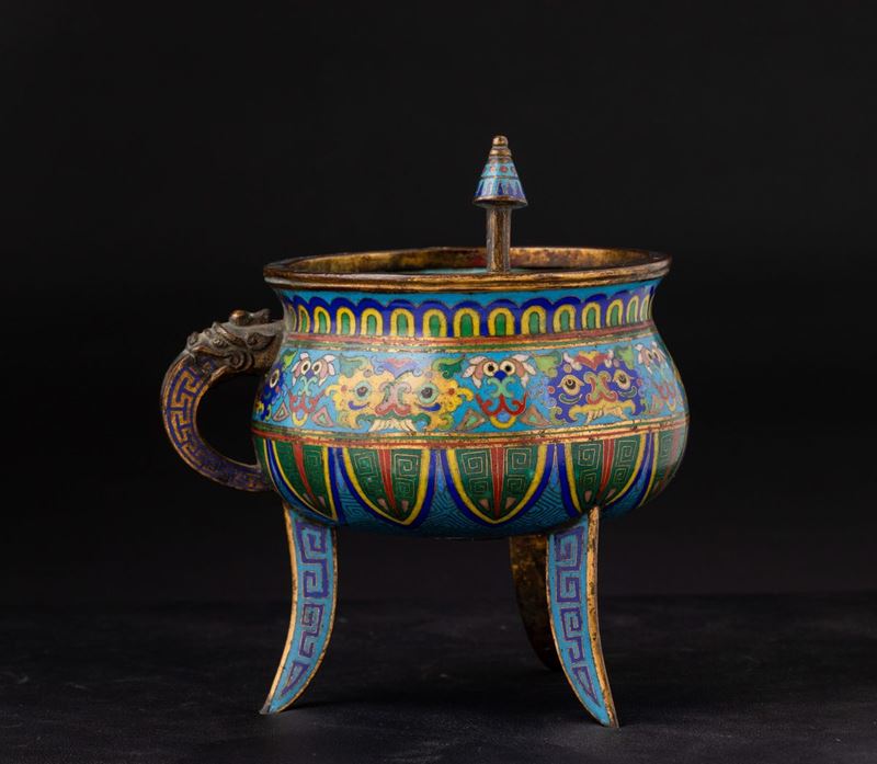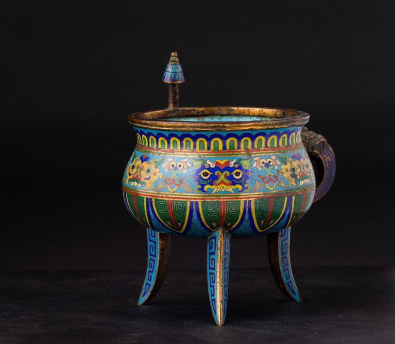 Incensiere tripode a smalti cloisonnè con decori d'ispirazione arcaica e ansa con mascherone, Cina, Dinastia Qing, XIX se [..]
