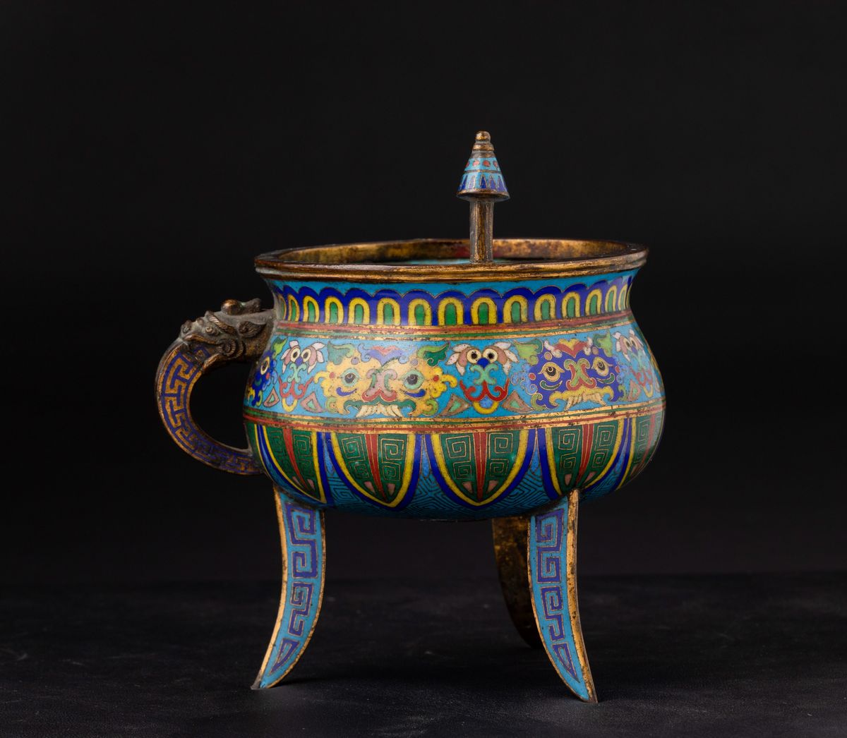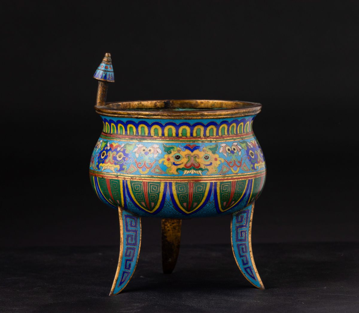 Incensiere tripode a smalti cloisonnè con decori d'ispirazione arcaica e ansa con mascherone, Cina, Dinastia Qing, XIX secolo