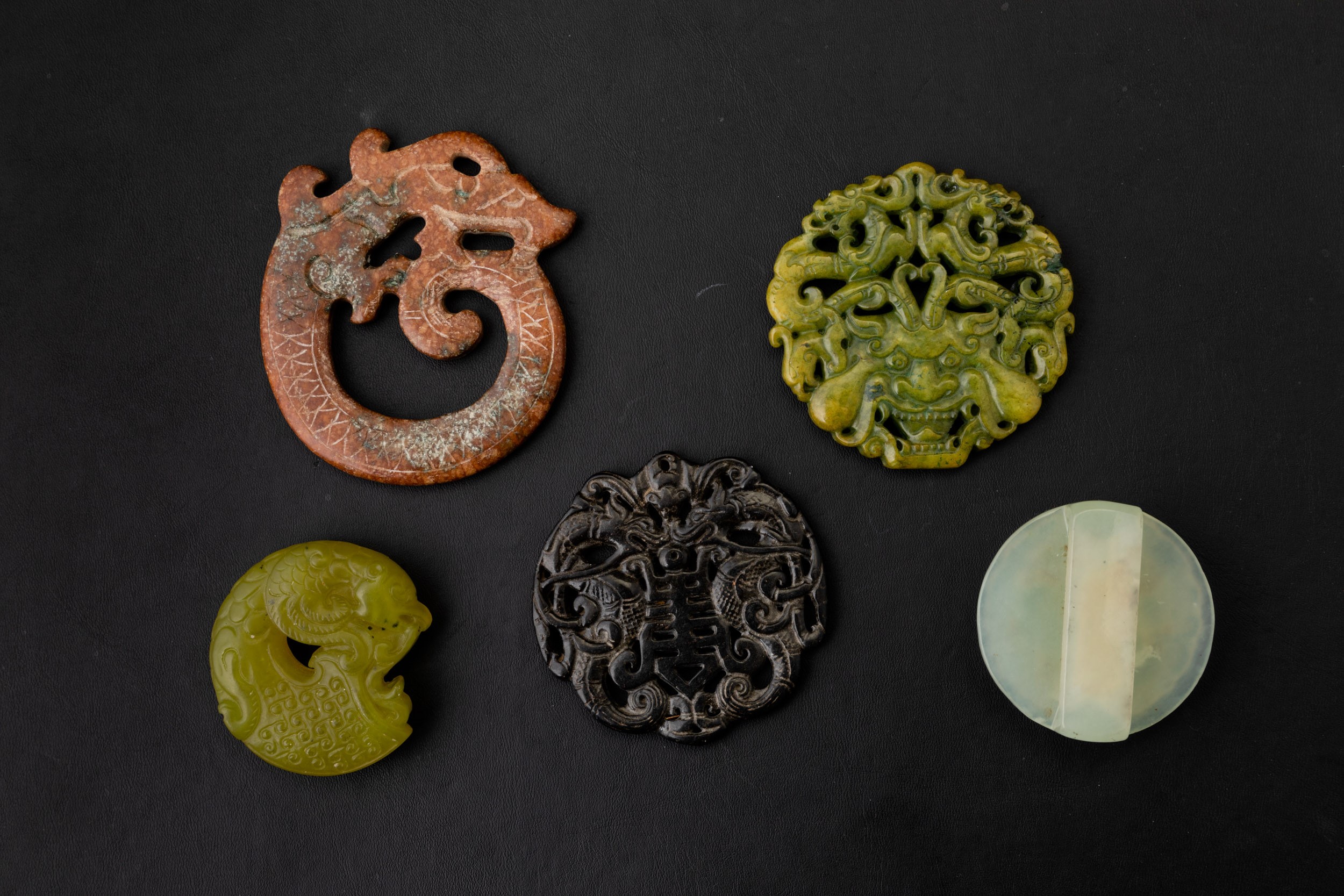 Lotto composto da cinque medaglioni in pietre dure con decori a rilievo e a traforo, Cina, XX secolo