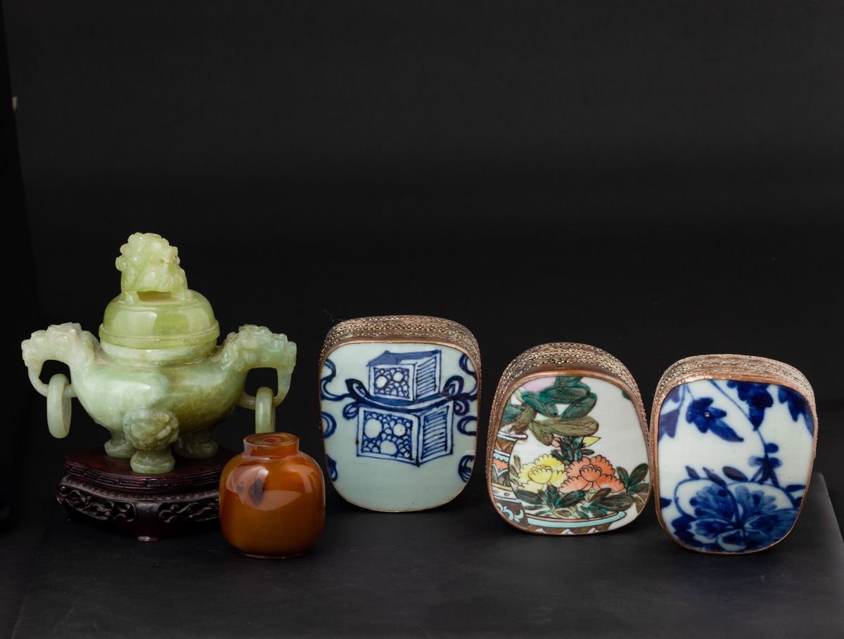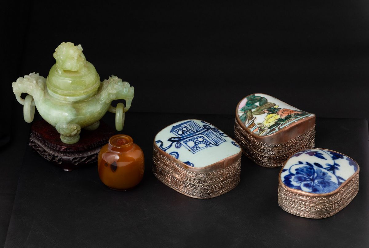 Lotto composto da incensiere scolpito in giada, tre cuscini in metallo e e porcellana e una snuff bottle in agata, Cina, [..]