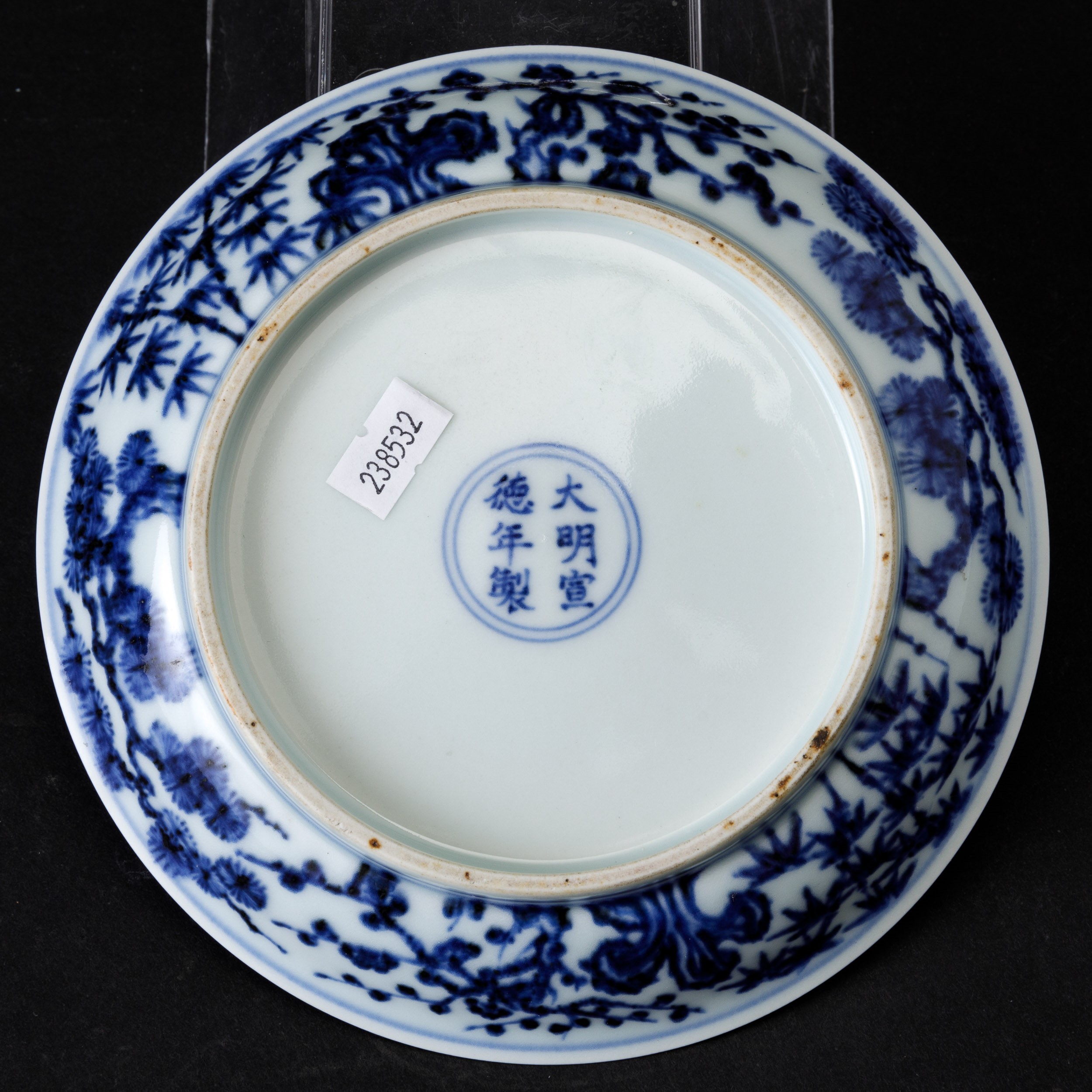 Piatto in porcellana bianca e blu con decori floreali e soggetto naturalistico centrale, Cina, XX secolo