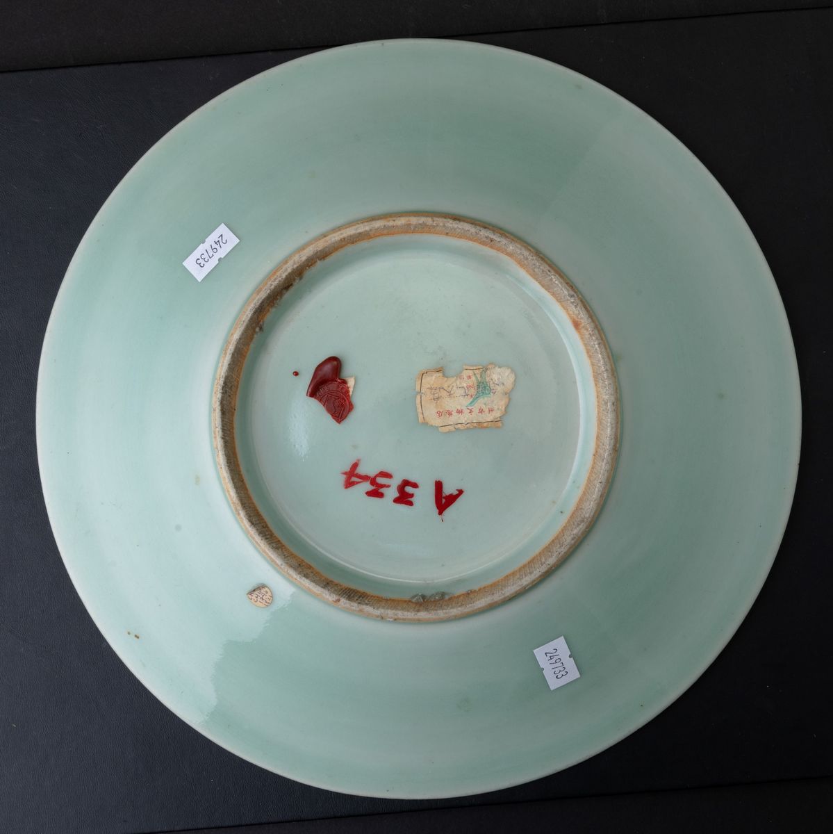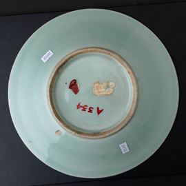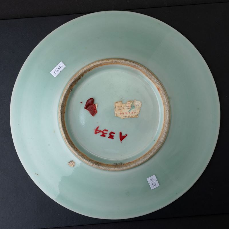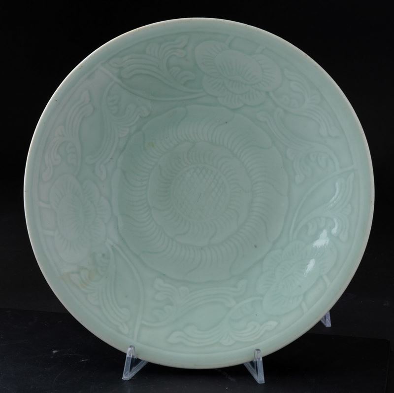 Piatto in porcellana Longquan color Celadon con decori floreali incisi, Cina, XX secolo