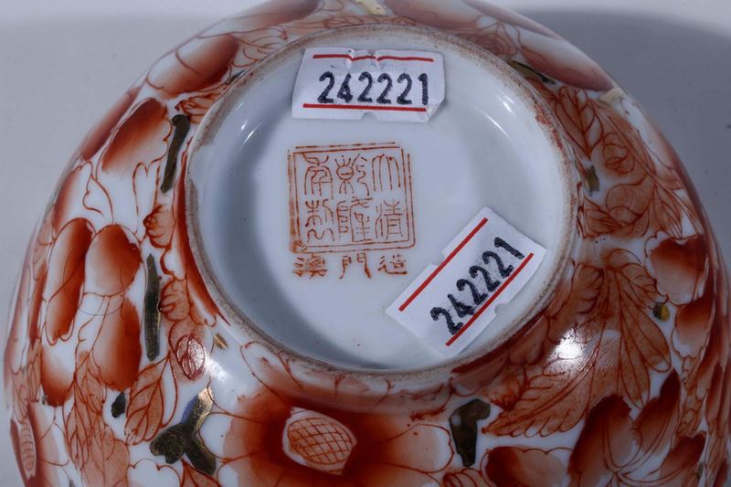 Piccola ciotola in porcellana con decori floreali sui toni del rosso, Cina, XX secolo