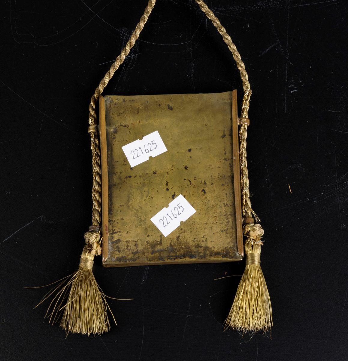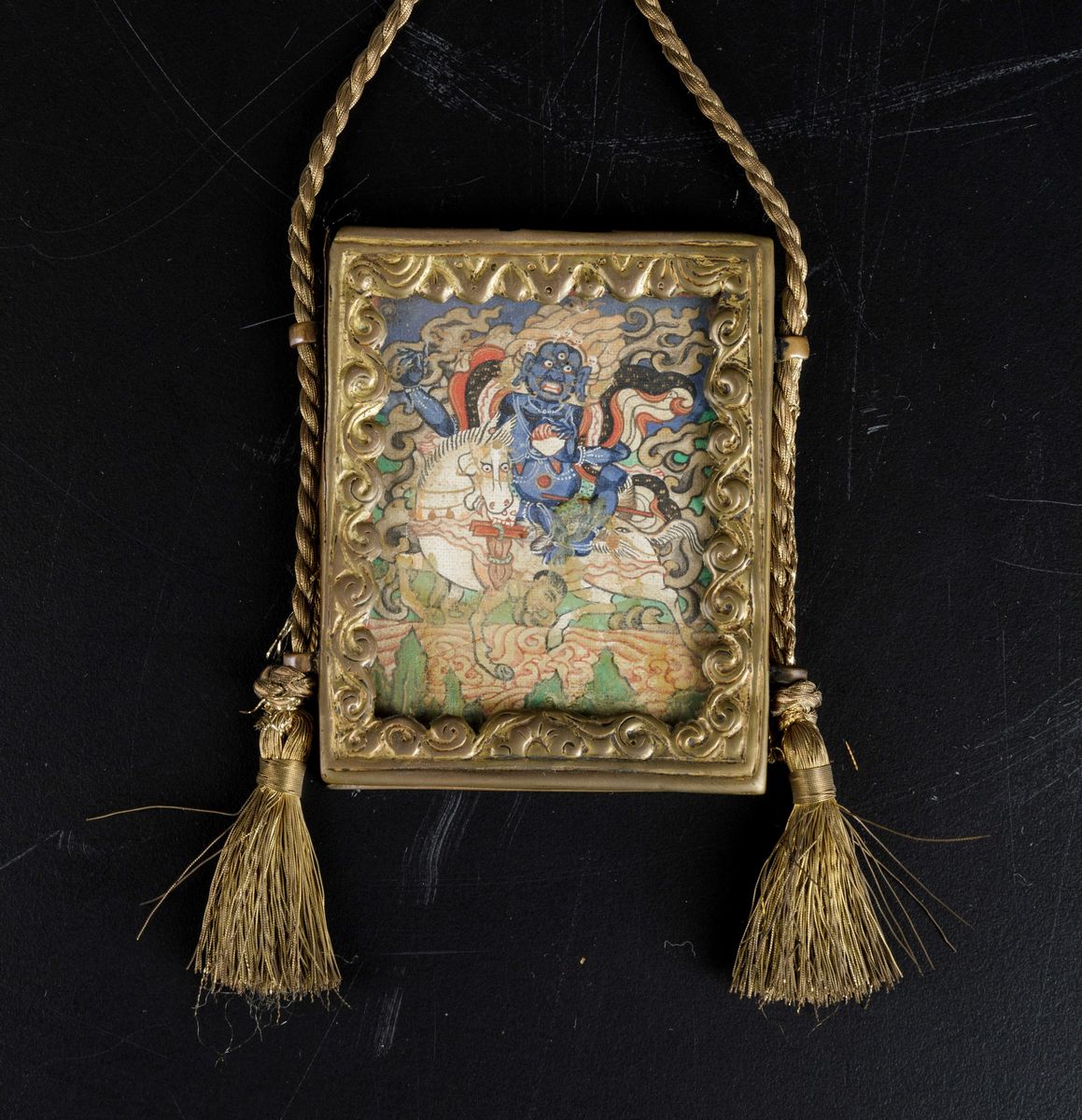 Piccolo pendente contenente dipinto su carta raffigurante divinità, Tibet, XIX secolo