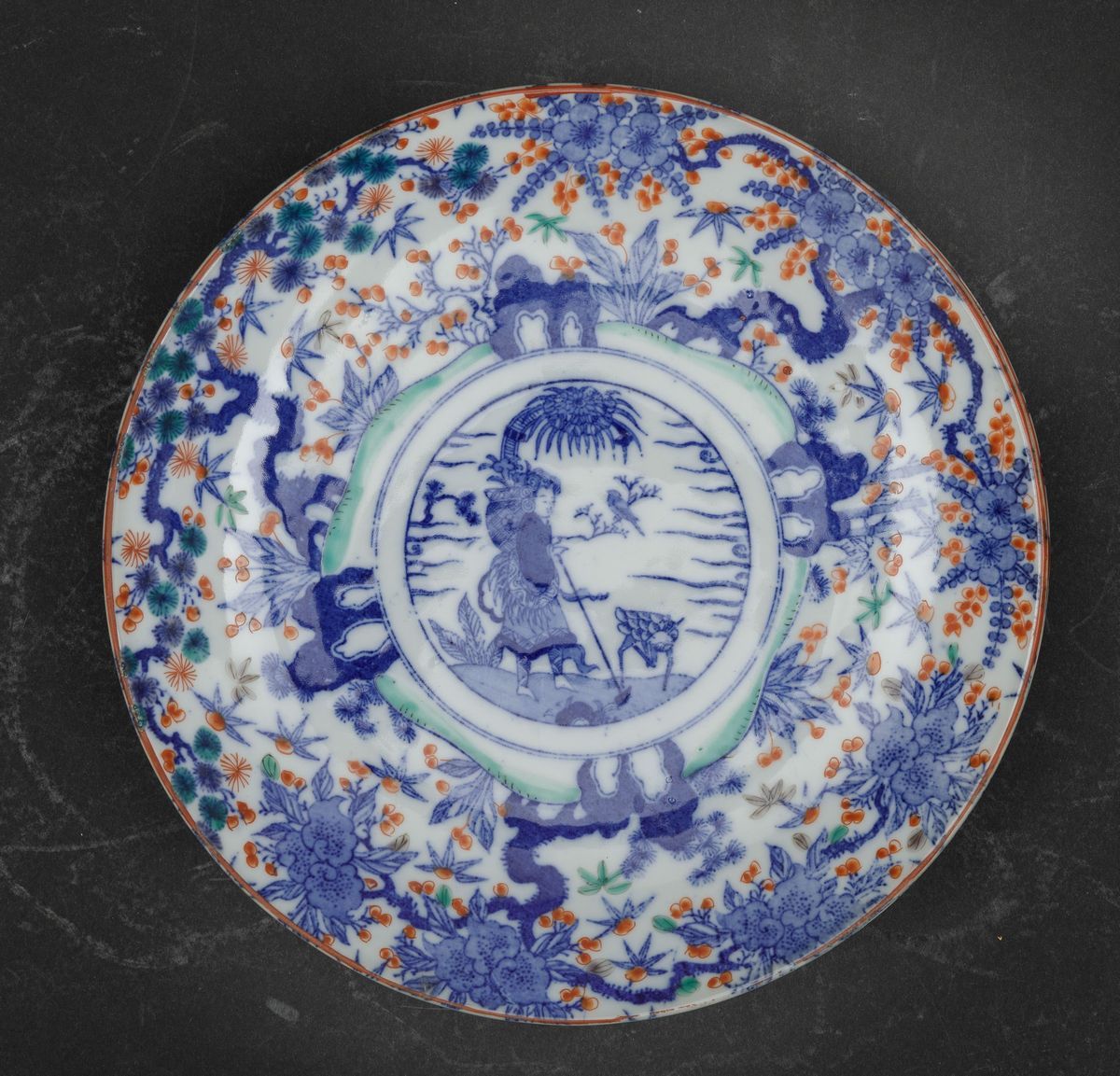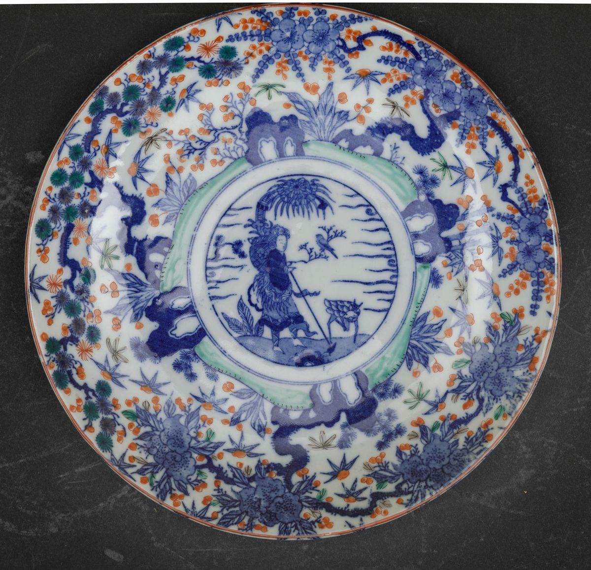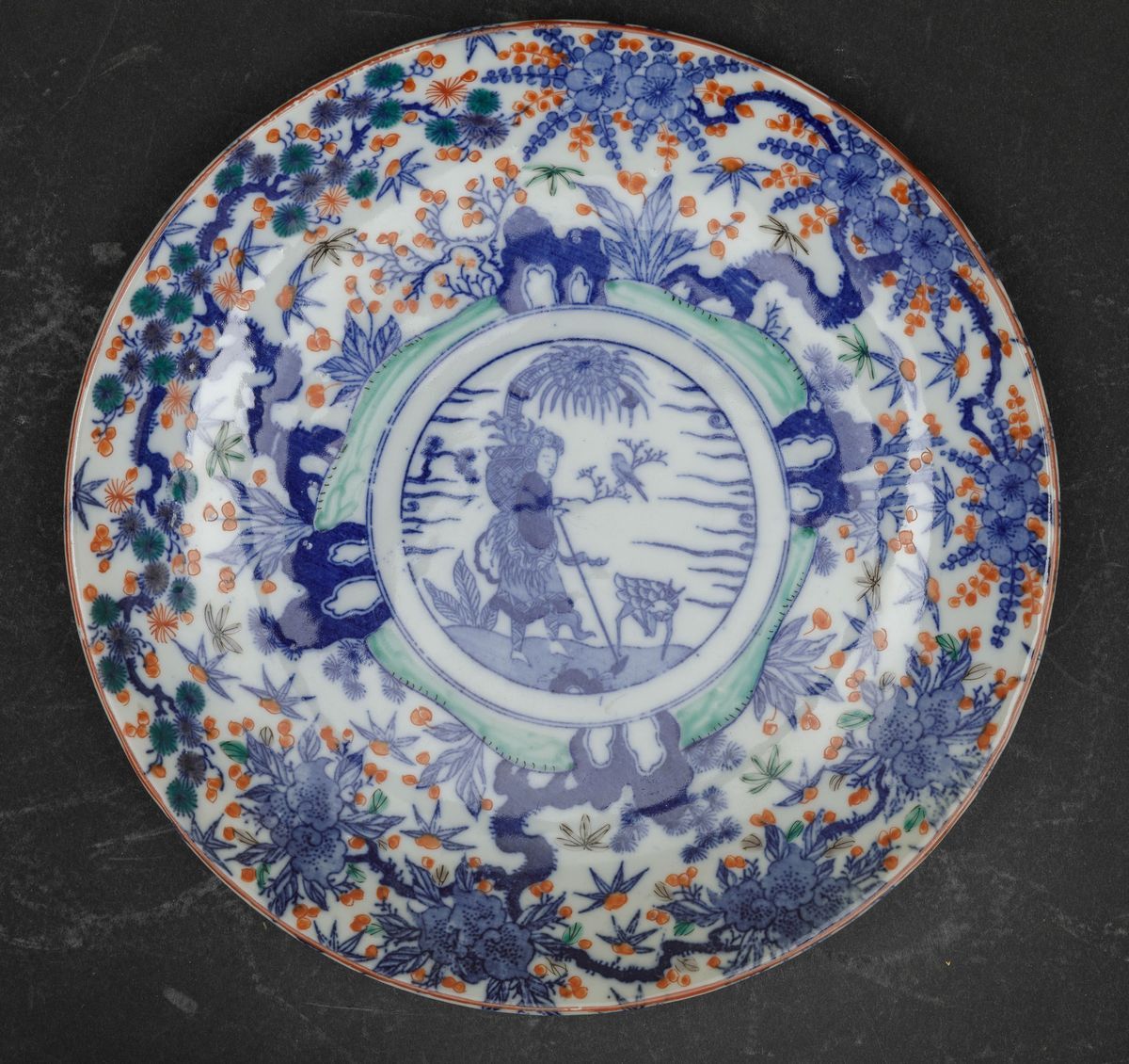 Quattro piatti in porcellana Imari con decori floreali e personaggi entro riserva centrale, Giappone, periodo Meiji (1868-1912)