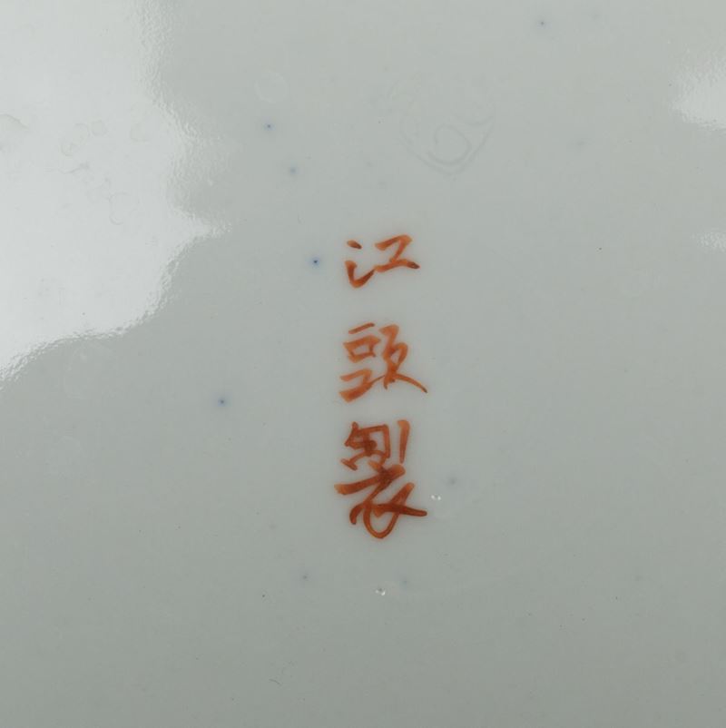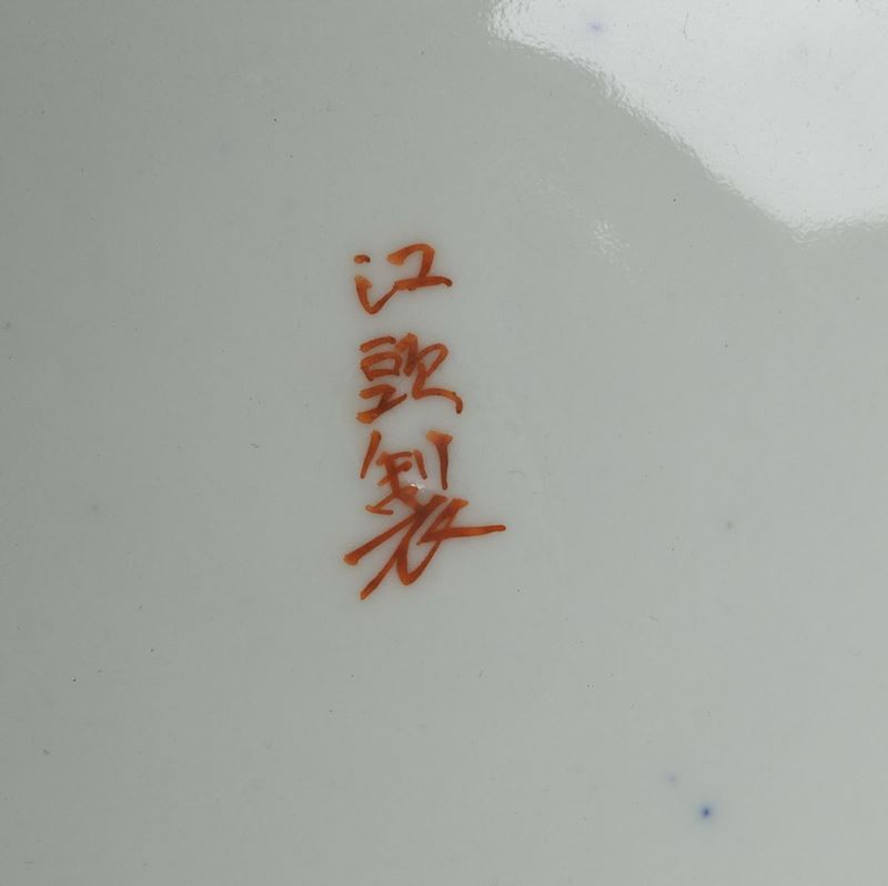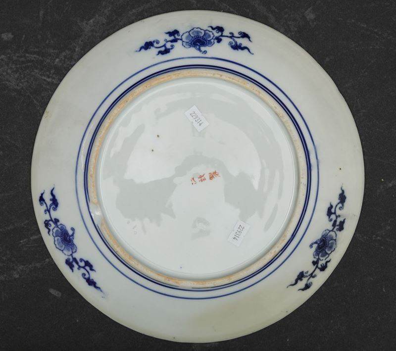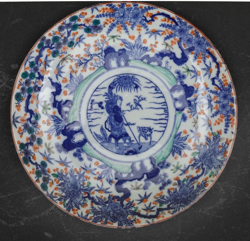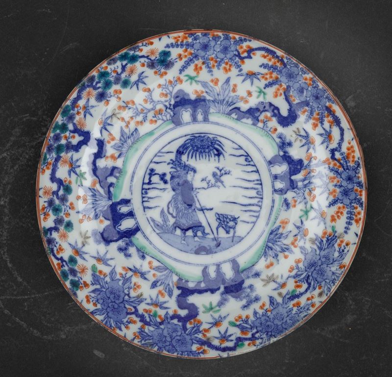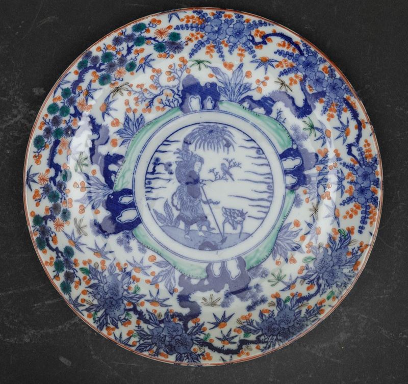 Quattro piatti in porcellana Imari con decori floreali e personaggi entro riserva centrale, Giappone, periodo Meiji (1868 [..]