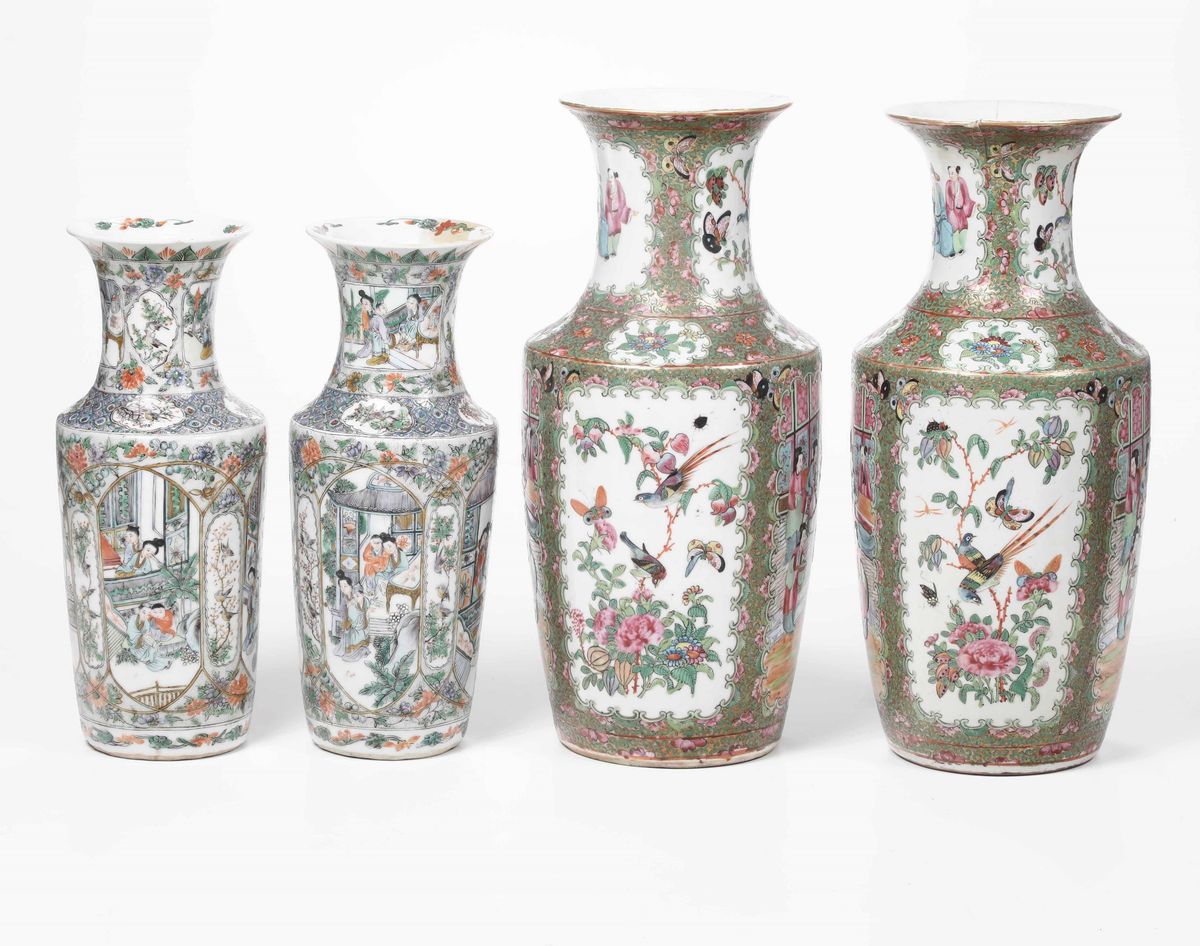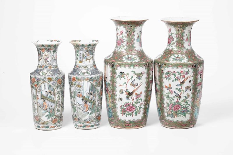 Quattro vasi in porcellana Canton con decori floreali e scene di vita comune entro riserve, Cina, Dinastia Qing, XIX seco [..]