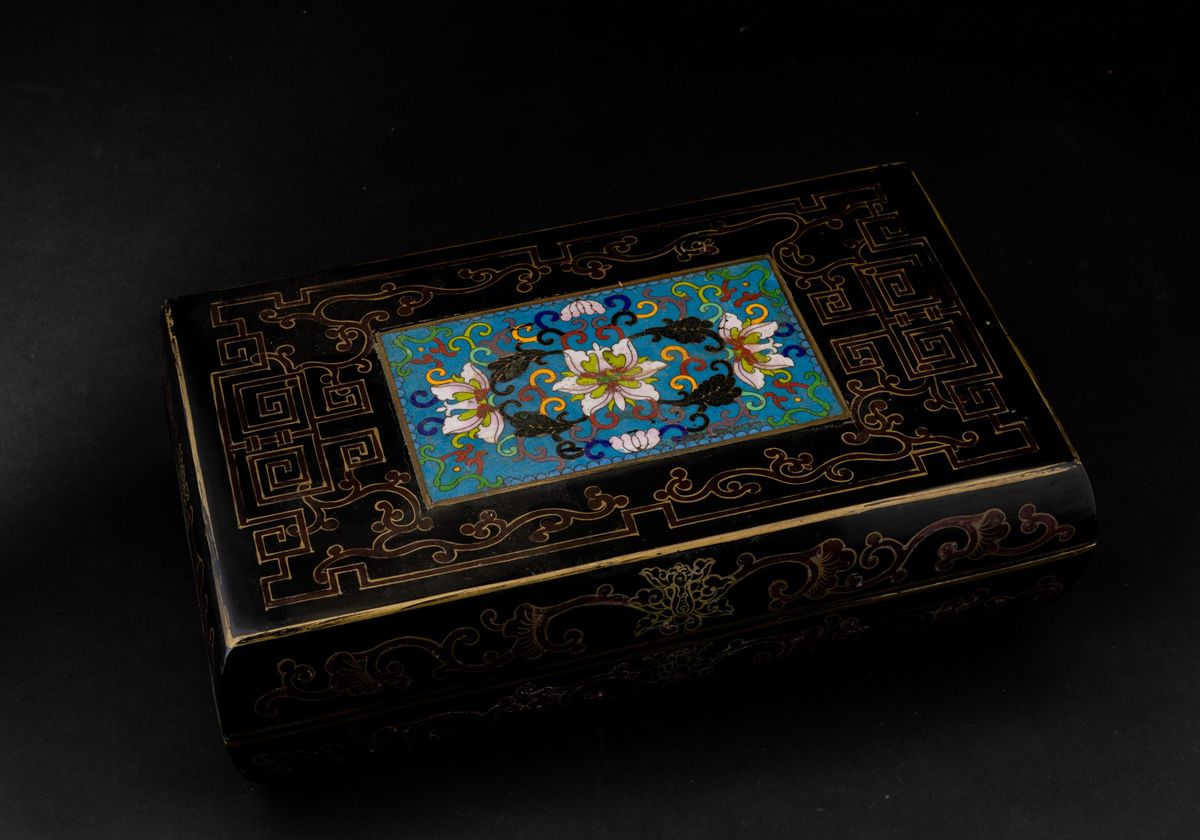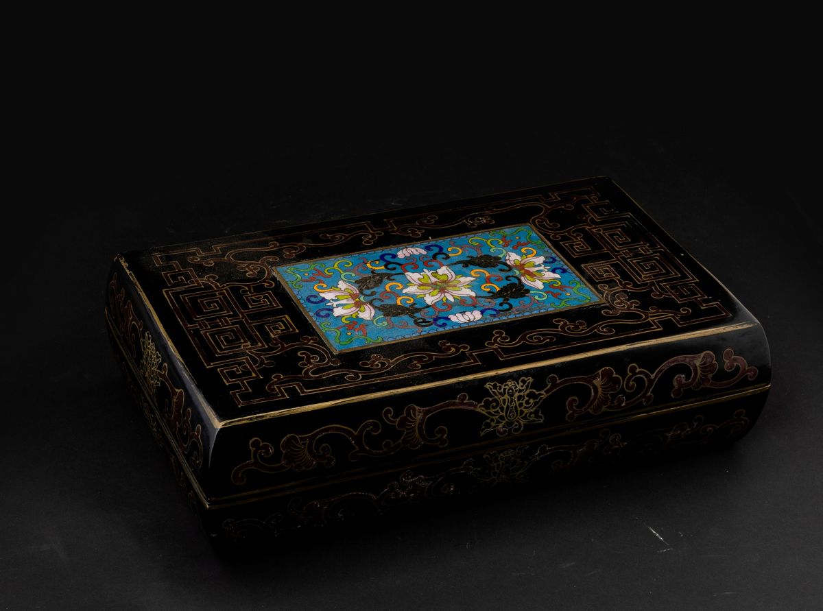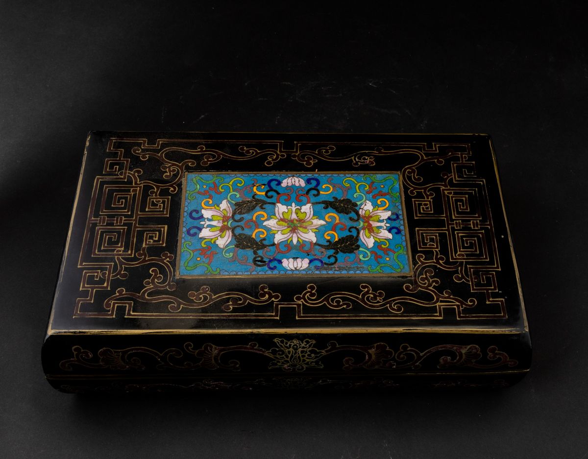 Scatola in legno laccato con decorazione centrale a smalti cloisonné con motivi a fiore di loto, Cina, Dinastia Qing, XIX secolo