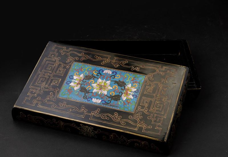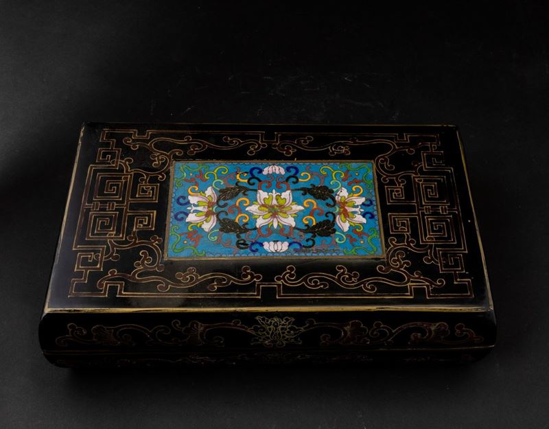 Scatola in legno laccato con decorazione centrale a smalti cloisonné con motivi a fiore di loto, Cina, Dinastia Qing, XIX [..]