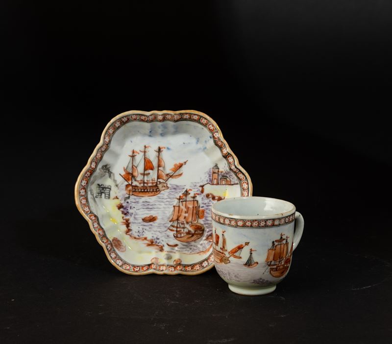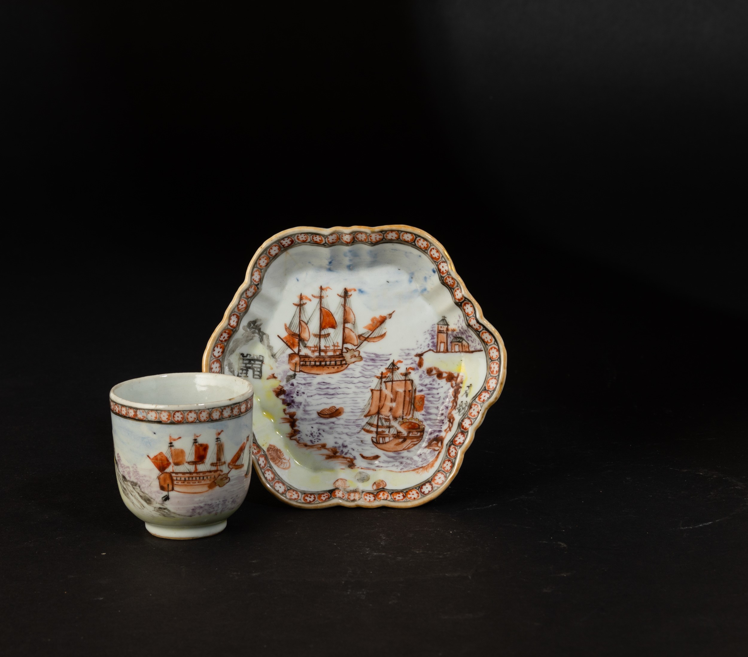 Tazzina con piattino in porcellana con raffigurazioni di velieri, Compagnia delle Indie, Cina, XIX secolo