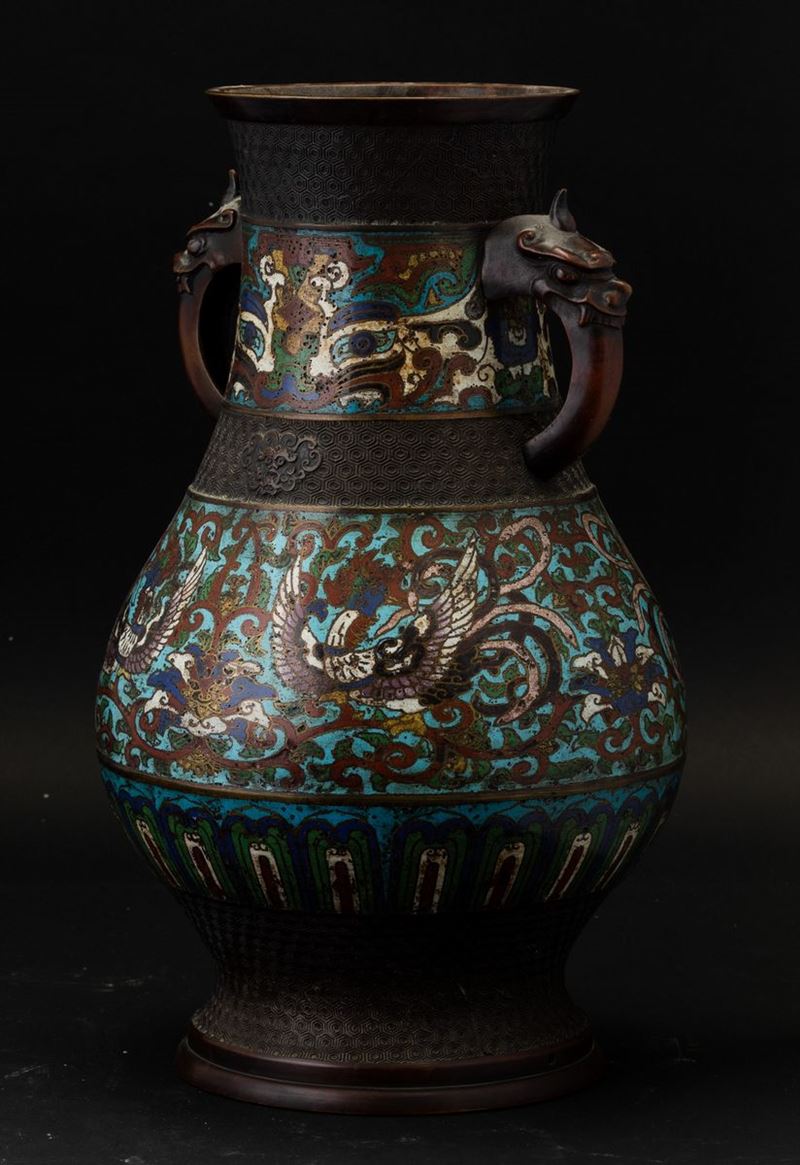Vaso in bronzo a doppia ansa a foggia di drago con decori a smalti cloisonnè raffiguranti gru e fiori di loto, Giappone, [..]