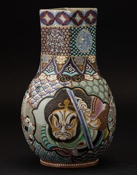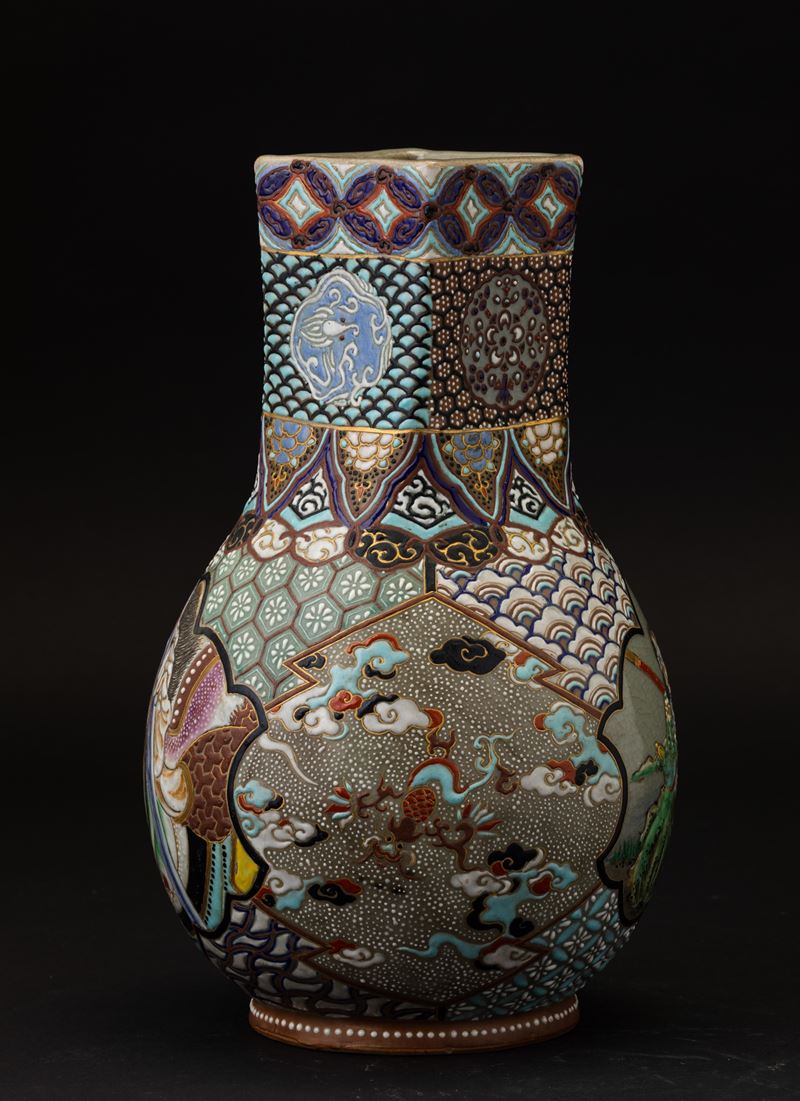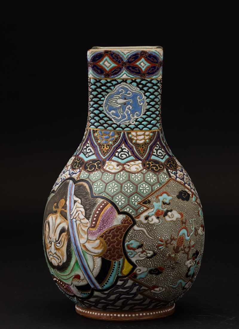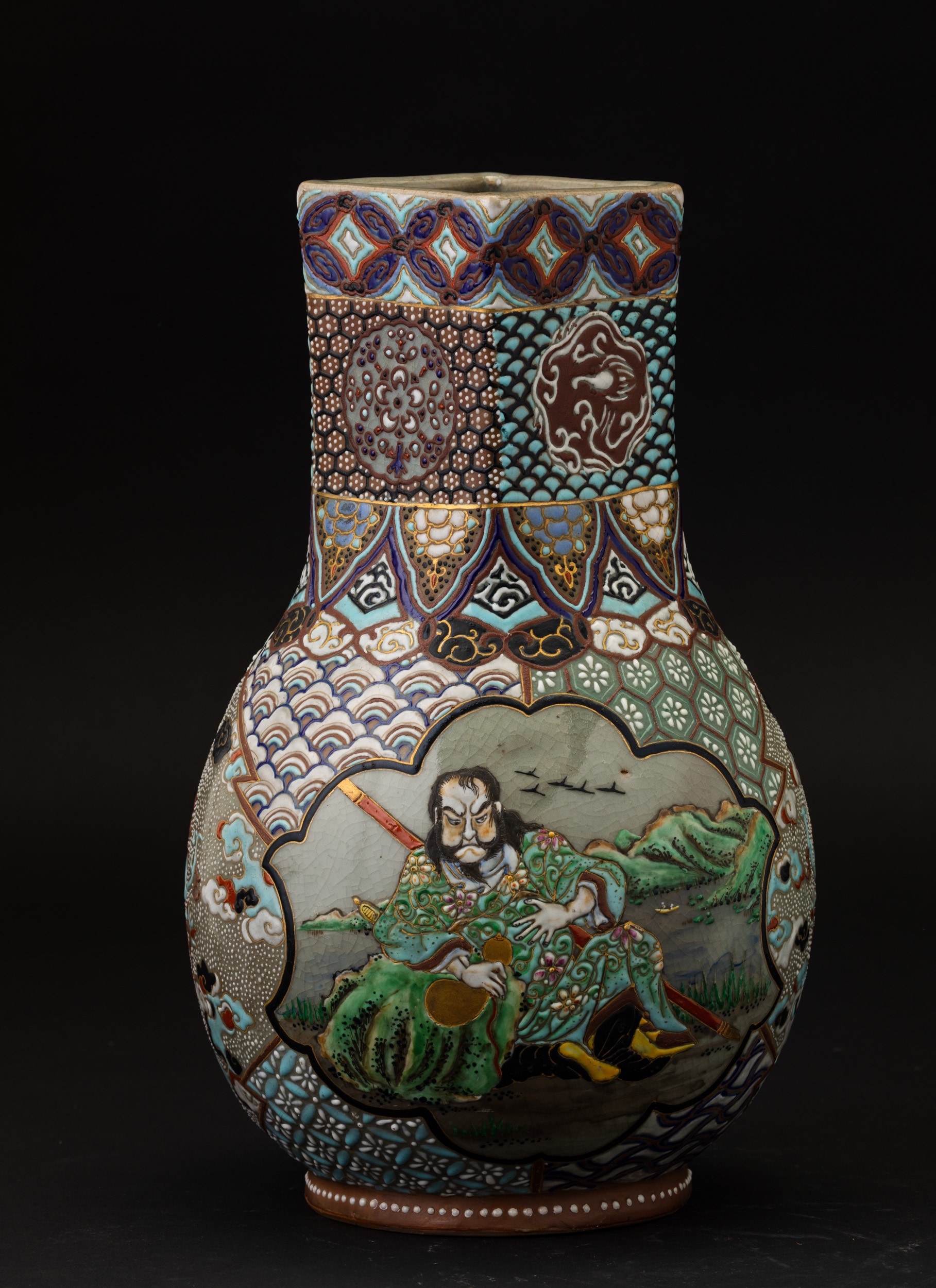 Vaso in porcellana con figure di guerrieri entro riserve sagomate e dettagli a rilievo, Giappone, periodo Meiji (1868-1912)
