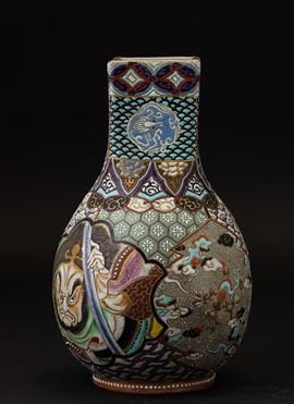 Vaso in porcellana con figure di guerrieri entro riserve sagomate e dettagli a rilievo, Giappone, periodo Meiji (1868-191 [..]