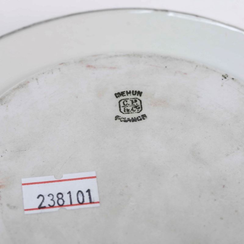Porcellana e argento sul bordo. Marca: simbolo grafico e "Mehun France" in nero; marchio dell'argento sul bordo. Dimensioni: altezza cm 5,5; cm 15,5. Conservazione: ottima