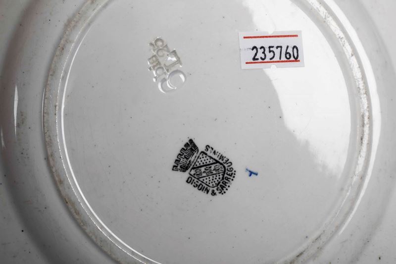 Terraglia in monocromia nera. Marca: stemma coronato con Digoin & Sarreguemines in nero. Diametro cm 19,5. Conservazione: buona; due piatti con felature
