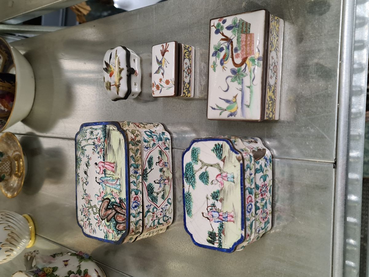 3 pezzi in porcellana e 2 pezzi in smalto. Dimensione massima: altezza cm 8,2; cm 15,2x11,4. Conservazione: 1 scatola in porcellana con rotture incollate e felatura; le scatole in smalto con felature e qualche vecchio restauro