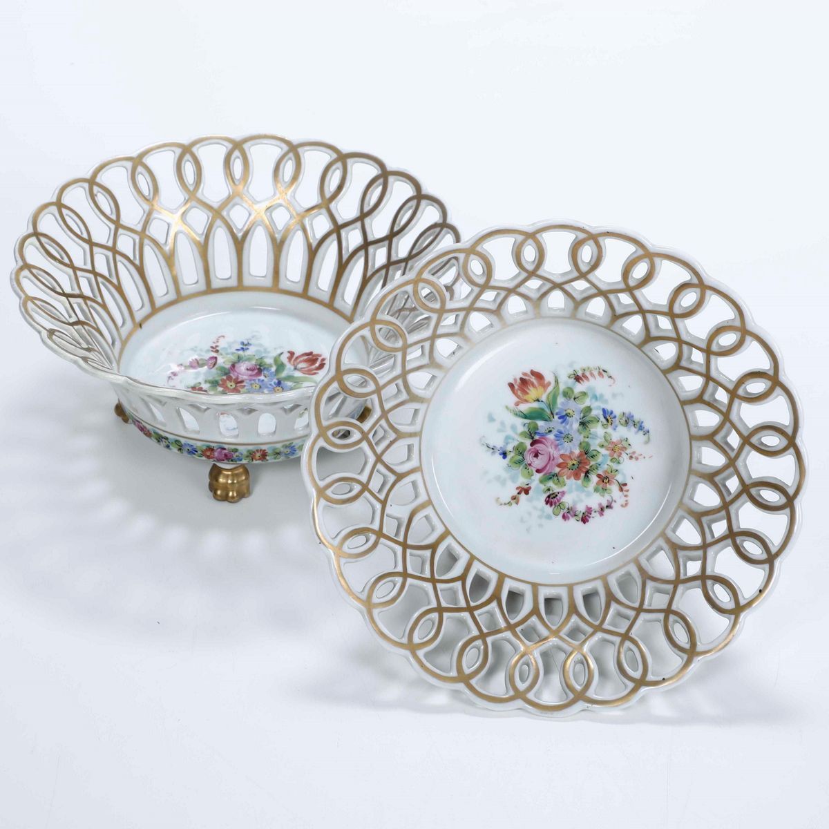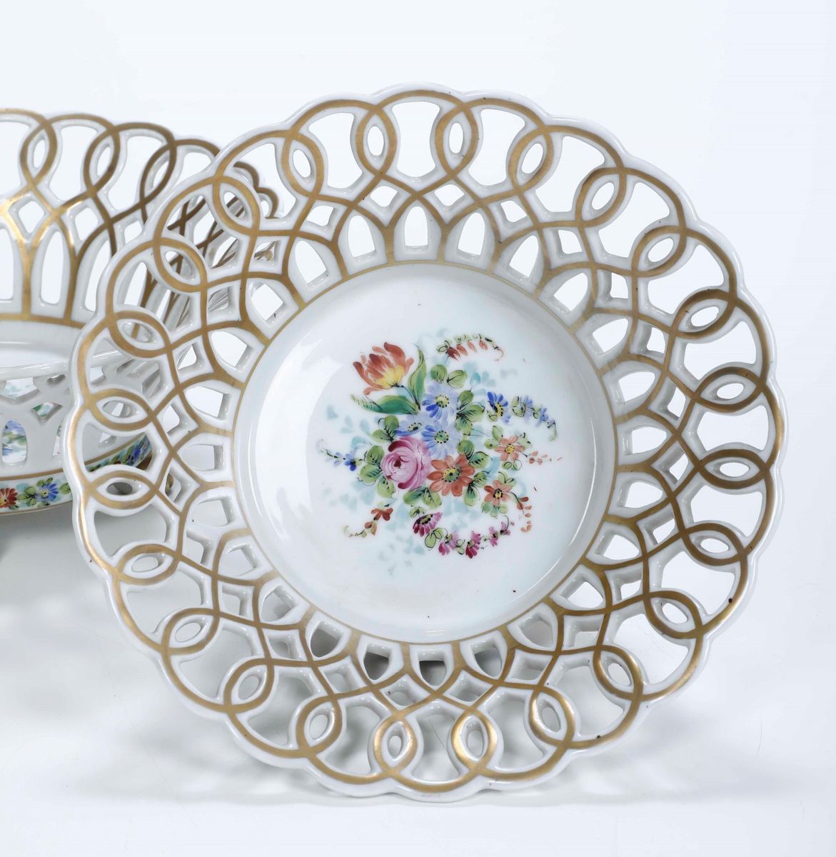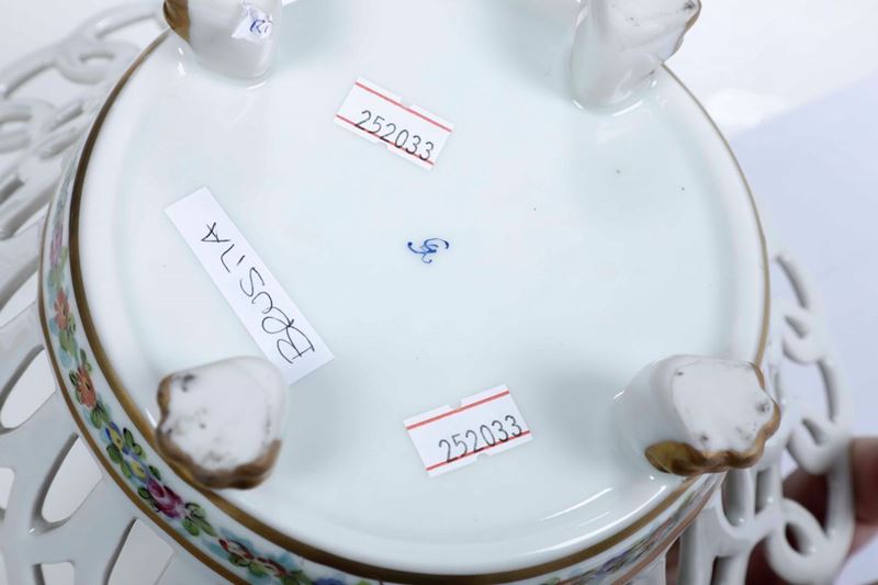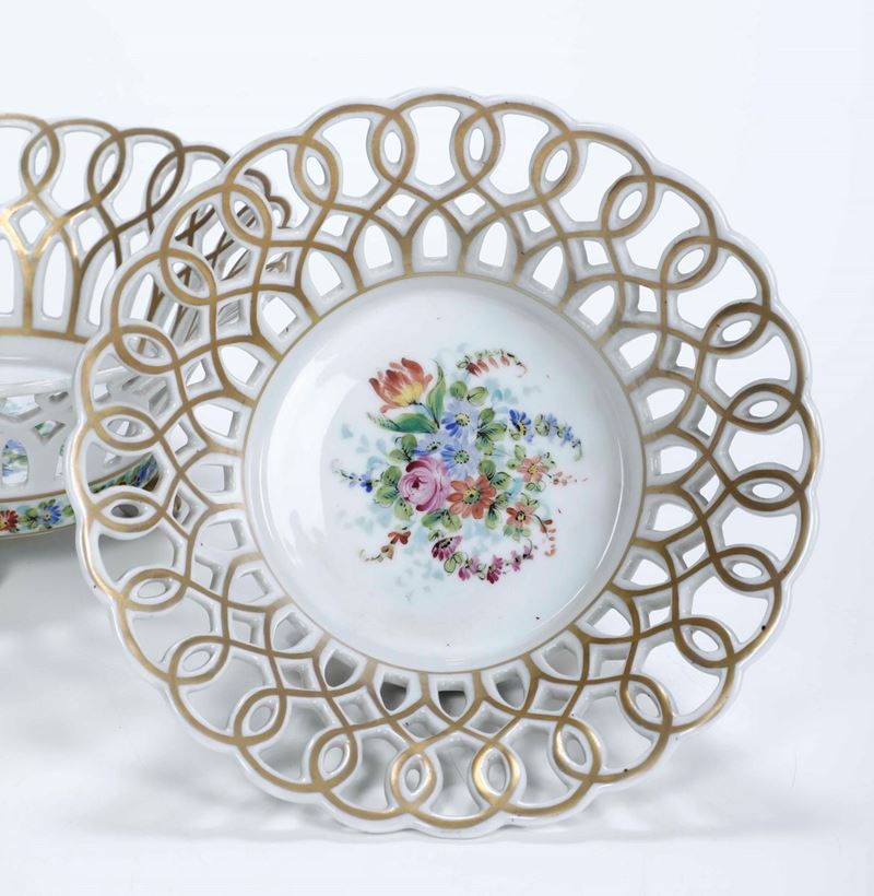 Porcellana policroma e dorata. Marca: "GL" in blu. Dimensioni: altezza cm 11; diametro cm 23,5. Conservazione: un cestino in ottimo stato; l'altro con parte del bordo traforato ricomposto in restauro