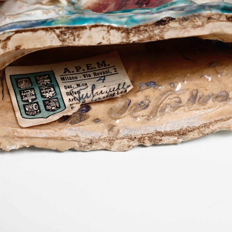 Maiolica policroma. Firma incisa; vecchia etichetta A.P.E.M. Dimensioni: altezza cm 15; 15x5,5. Conservazione: ottima; insignificanti sbeccature al bordo della base