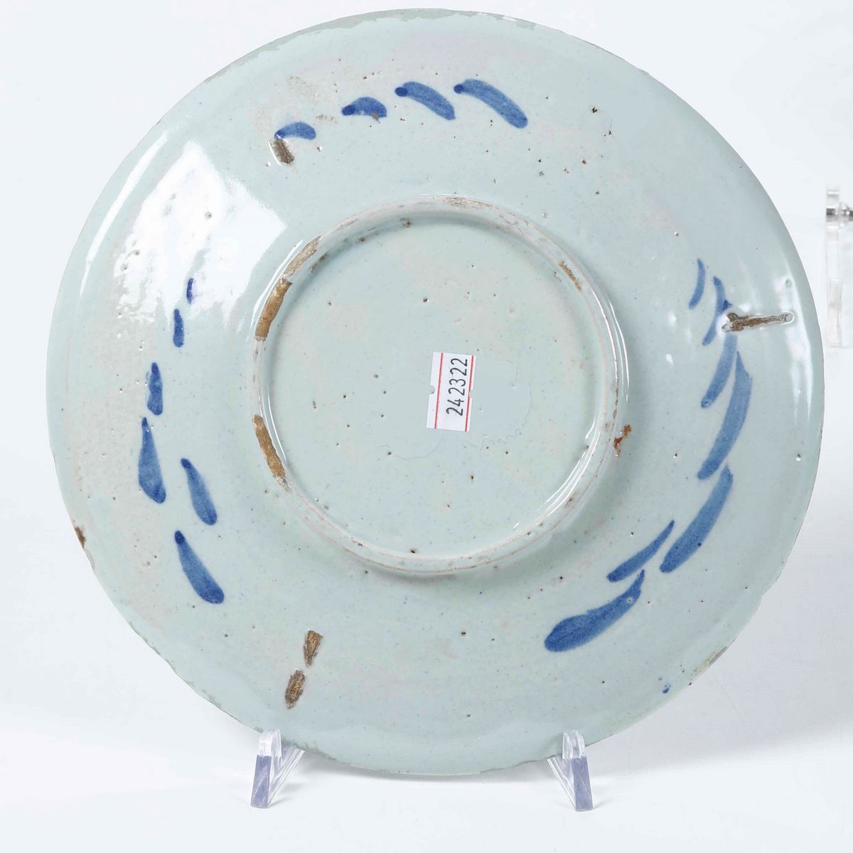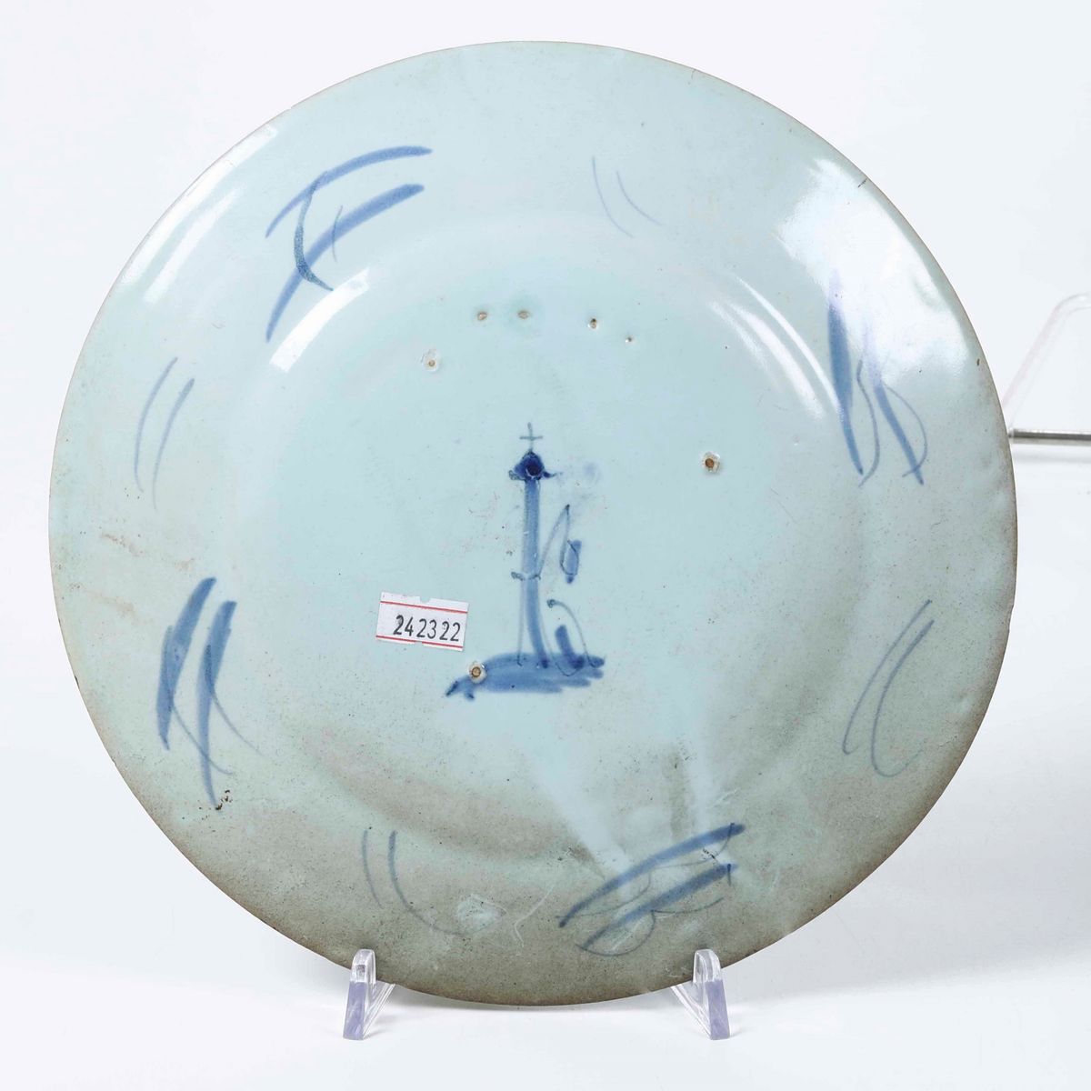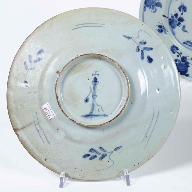 Maiolica in monocromia blu di cobalto. Marca: su 2 pezzi lanterna. Diametro cm 23,5; cm 21,5. Conservazione: buona; il piatto più piccolo con restauro sulla tesa