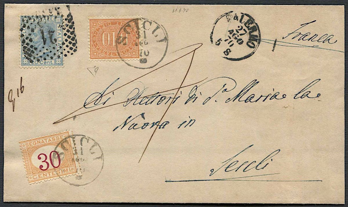 Insufficientemente affrancata con 20 cent. (S. T26), tassata per 40 cent. con segnatasse da 10 cent. (S. 2) e da 30 cent. (S. 7) di due diverse emissioni. Al verso bolli di transito di Catania, Modica e di arrivo a Scicli. Molto bella, rara tassazione.