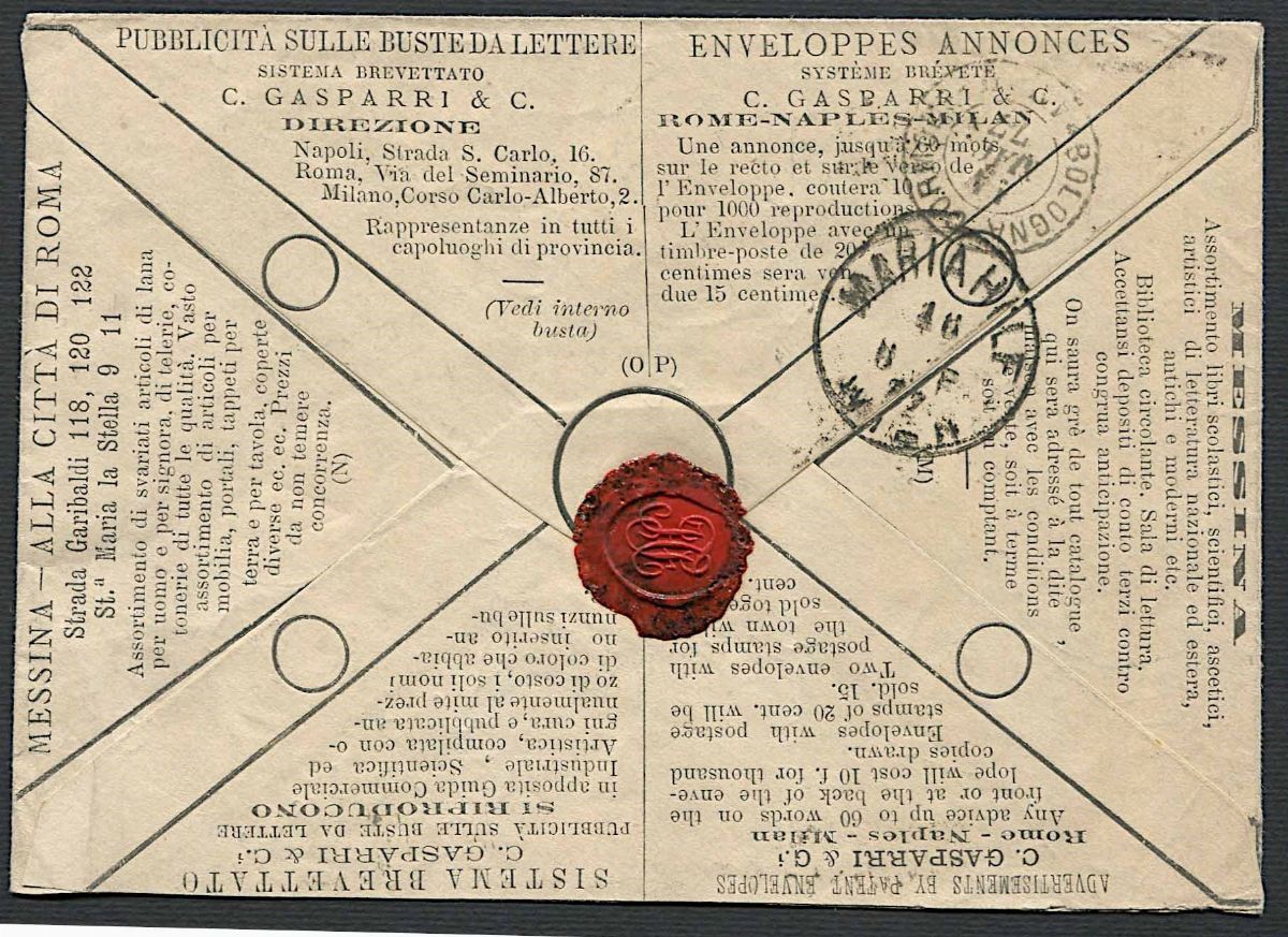 Con affrancatura aggiuntiva di 10 cent. ocra (S. T17) in tariffa per l’estero. Il 20 centesimi azzurro con i due consueti tagli di rasoio che ne rendeva difficile il riutilizzo. Rarissimo documento postale, uno dei tre esemplari esistenti, in eccellente stato di conservazione. Cert. Raybaudi, Cert. Colla.