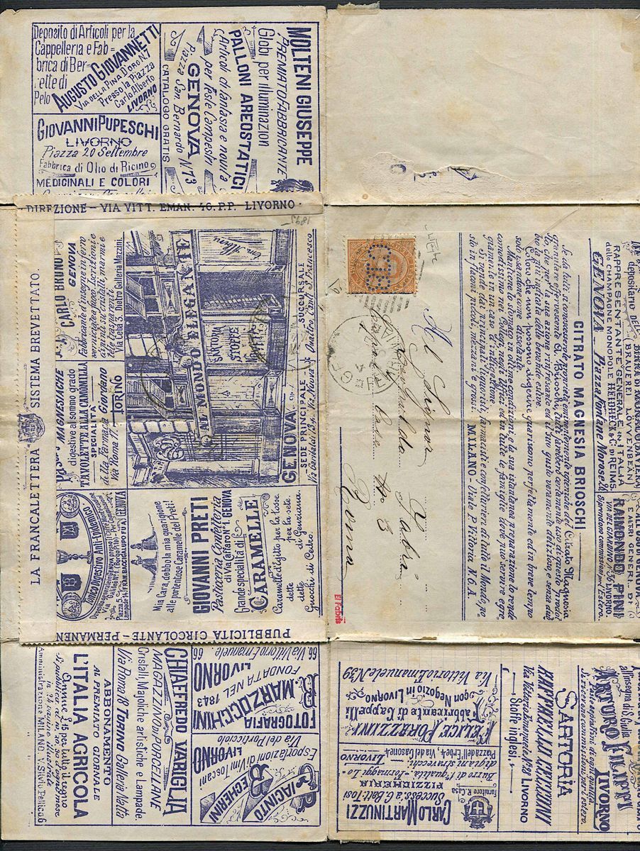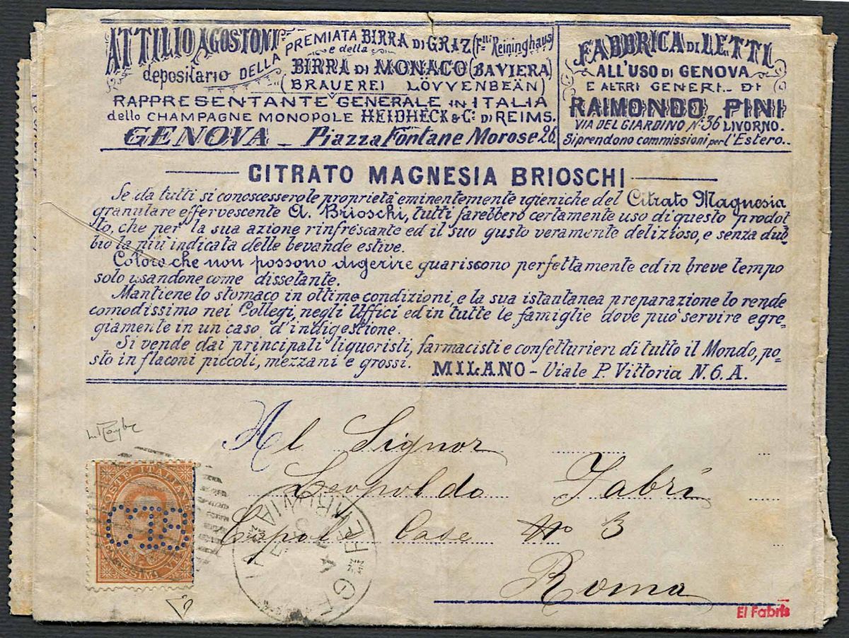 Con perforazione “C18”, da Genova per Roma dell’11 aprile 1887. In eccellente stato di conservazione, rara. Cert. E. Diena e Raybaudi.
