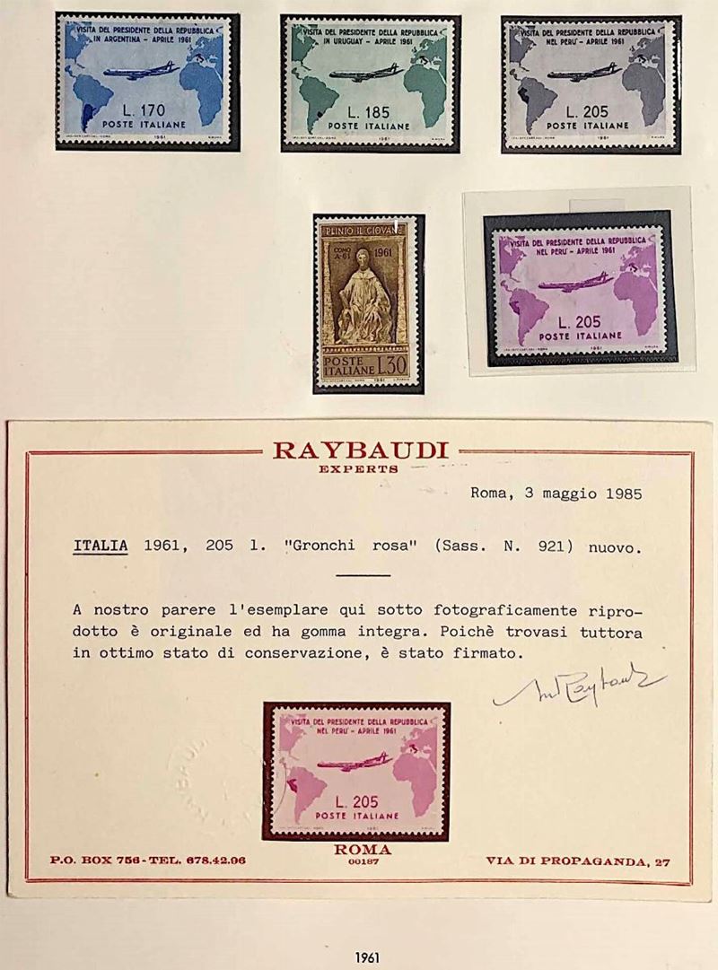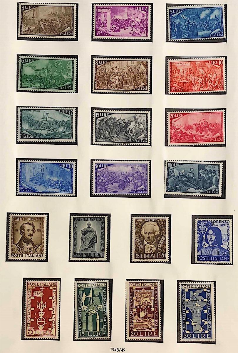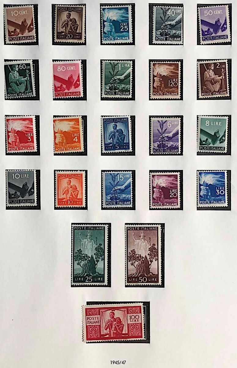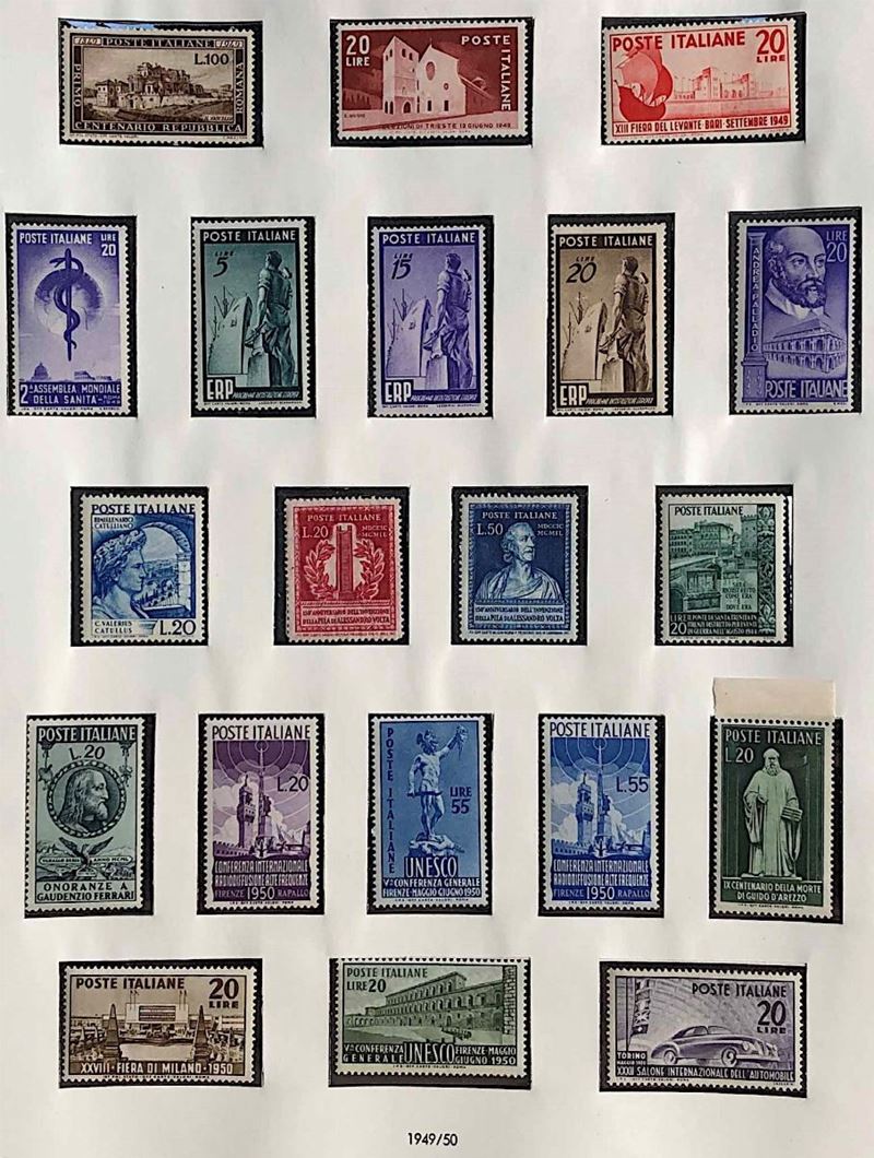 Con gomma integra in 19 volumi. Le annate 1945/1978 in due album SAFE, le altre dal 1979 al 2018 in 17 Album Marini. La collezione comprende tutte le serie ordinarie e commemorative del periodo, comprese le prime, il "Gronchi rosa", i foglietti, i servizi. Sono escluse la serie Pacchi Postali e il "cavallino" con filigrana ruota, presenti in lotti separati in questa asta. Tutto il materiale è di ottima qualità, alto valore di catalogo, merita attenta visione. Certificato Caffaz per i pacchi in concessione (S.2/4) e Raybaudi per il "Gronchi rosa".