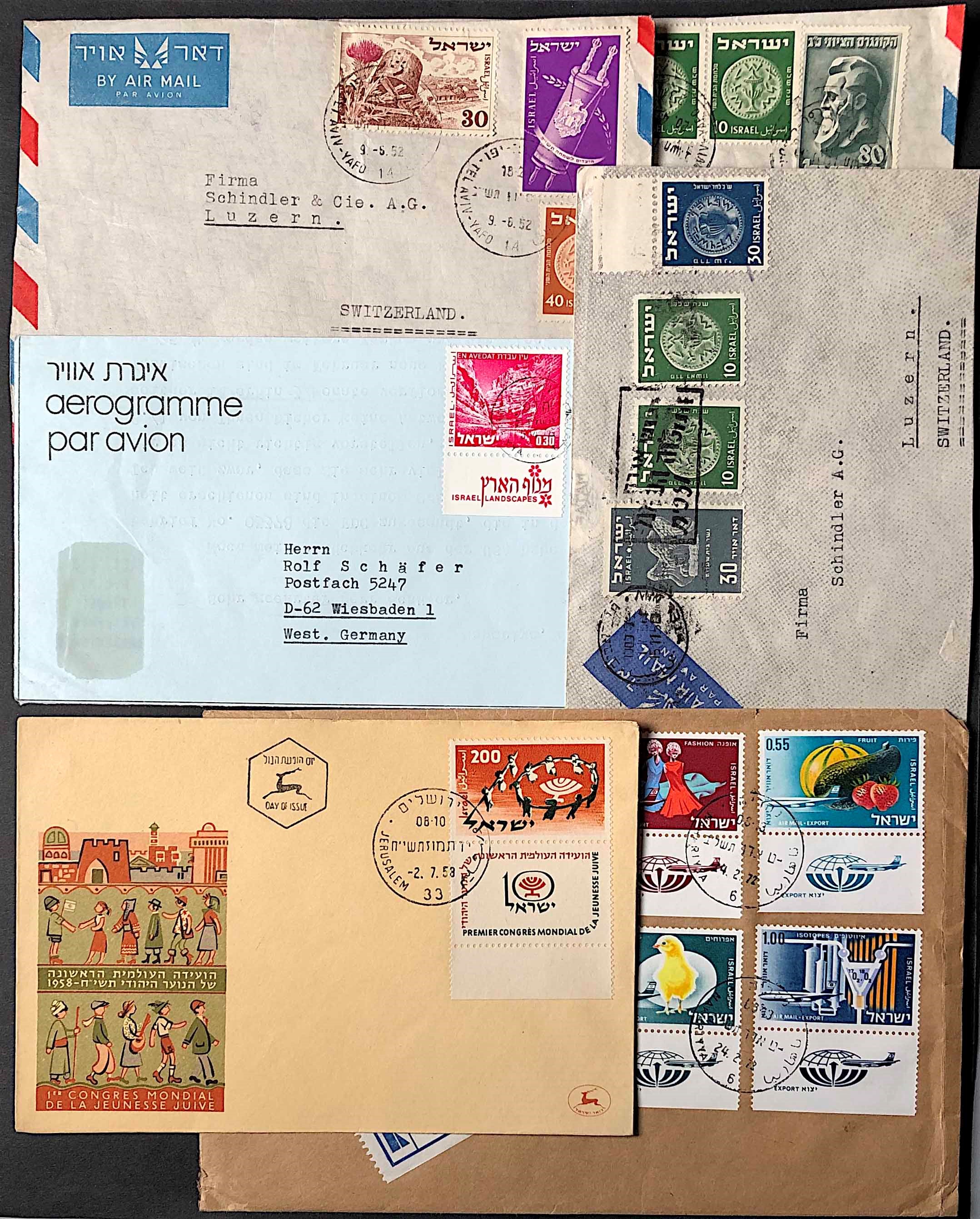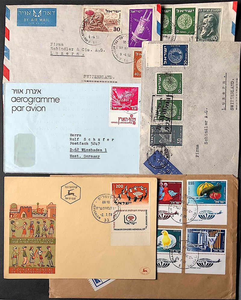 Una con BF dal 1957 al 1976 in tre volumi. In più, una collezione di Palestina nuova dal 1994 al 1998. Inoltre 300 buste in gran parte filateliche 1° giorno e molte altre viaggiate. Corposo insieme di grande interesse per lo specialista. Merita attenta visione, alto valore.