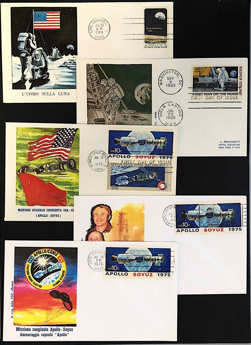 Due volumi edizione "Philgraf". Decine di buste con annulli commemorativi ed emissioni di francobolli in ricordo delle storiche missioni spaziali. Notati alcuni fogli e diverse buste celebrative della missione "Apollo-Soyuz" del 1975. Ottima qualità, di interesse didattico per giovani studenti.