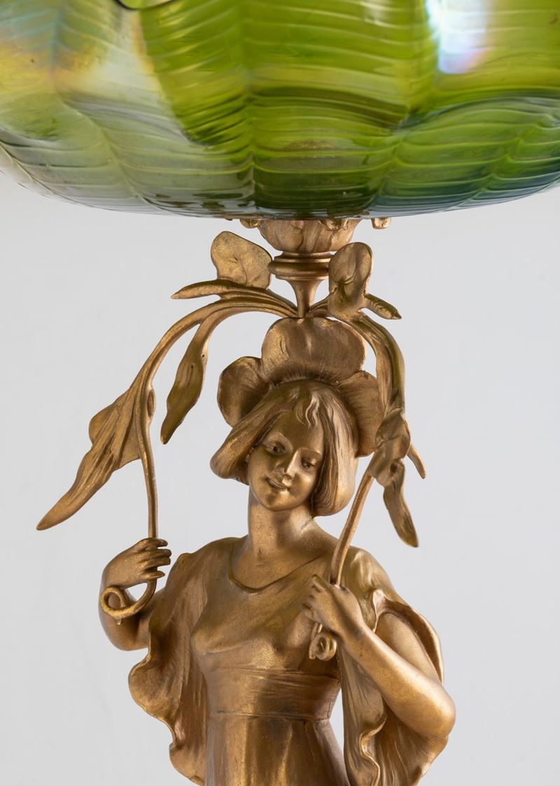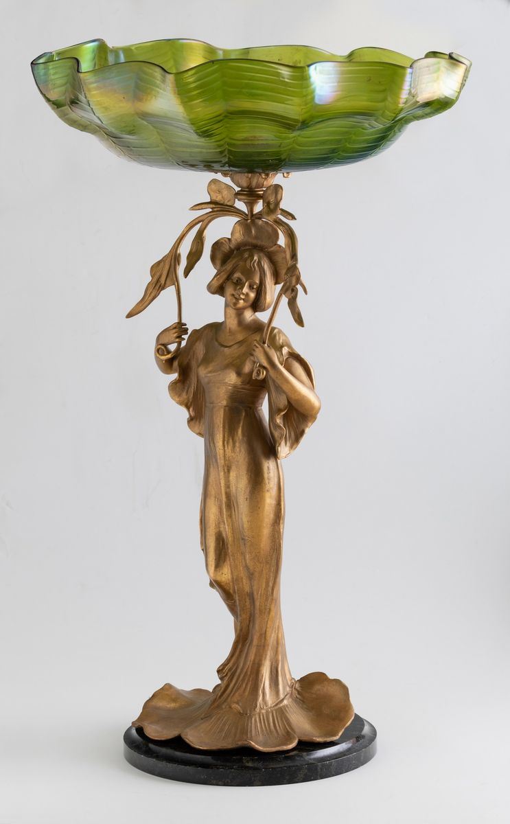 Grande alzata Liberty in forma di figura di donna con rami di fiori in metallo dorato reggente grande coppa costolata in vetro iridato. Basamento circolare in marmo nero.