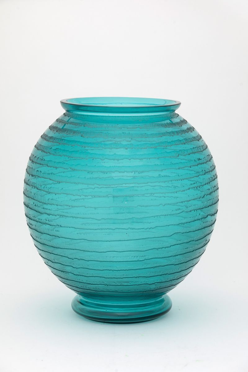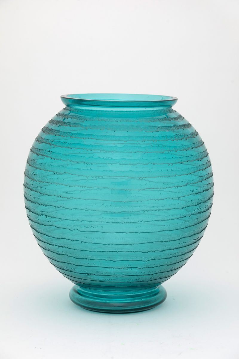 Grande vaso a sfera in cristallo con decoro di fasce corrose.