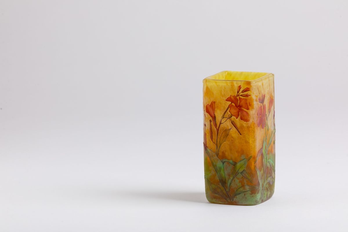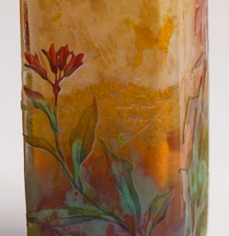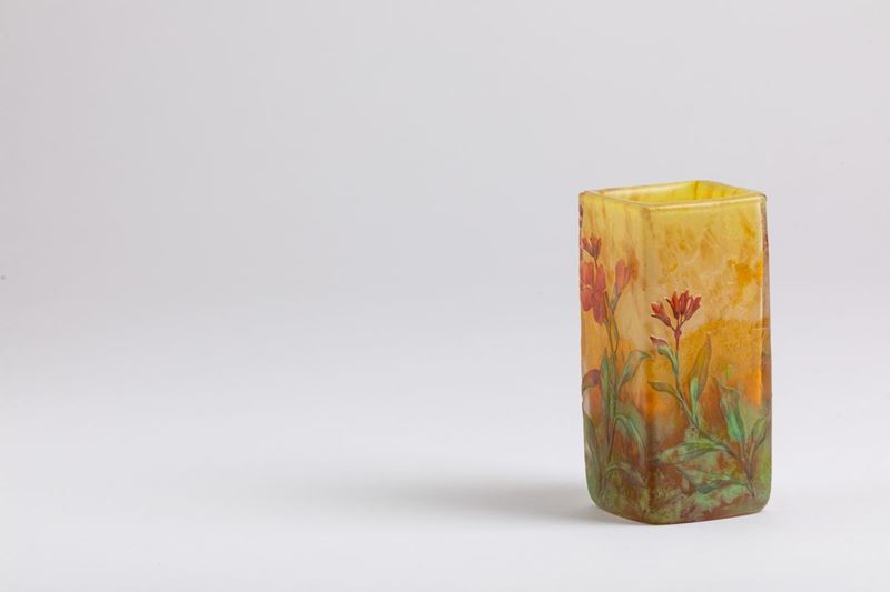 Vaso a sezione quadrata in vetro a cammeo con decoro floreale a smalti policromi.